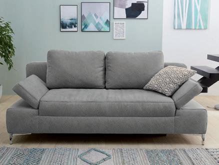 bestehend aus: 1 Zweisitzer mit Schlaffunktion und Armlehne links, 1 Ottomane mit Bettkasten und Armlehne rechts, mit Kopfteilverstellung, Stellmaß ca. 285 x 185 cm, Liegefläche ca. 212 x 125 cm, Stoff grau