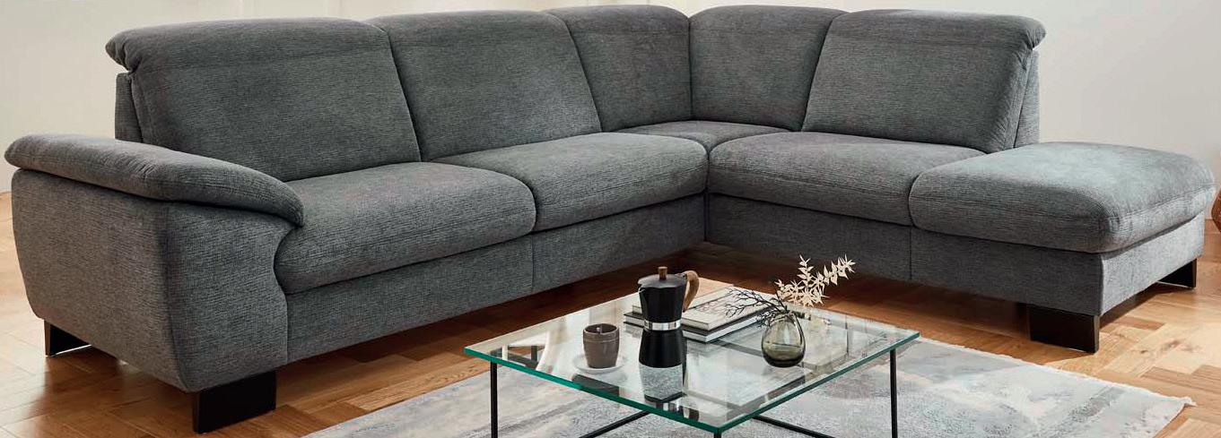 bestehend aus: 1 Zweisitzer links mit elektrischer Sitztiefenverstellung, 1 Ottomane rechts, mit Kopfteilverstellung, mit Bonellfederkernpolsterung, mit Kissen, Stellmaß ca. 232 x 295 cm, Liegefläche ca. 105 x 217 cm, Stoff anthrazit, Metallfüße schwarz