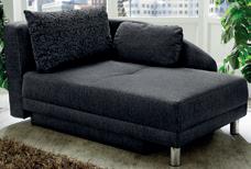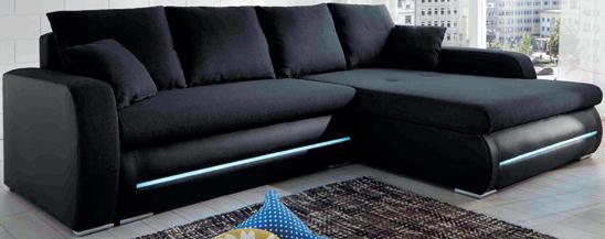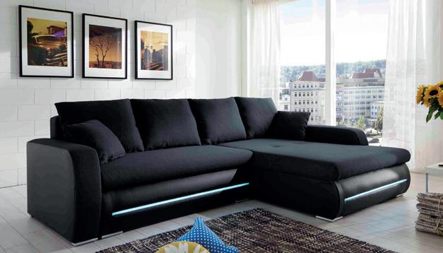 comprenant: 1 canapé 2 places avec fonction convertible, espace de rangement et accoudoir à gauche, 1 méridienne à droite, avec coussins et éclairage LED, encombrement env. 267 x 178 cm, couchage env. 234 x 138 cm, tissu noir 1018000500