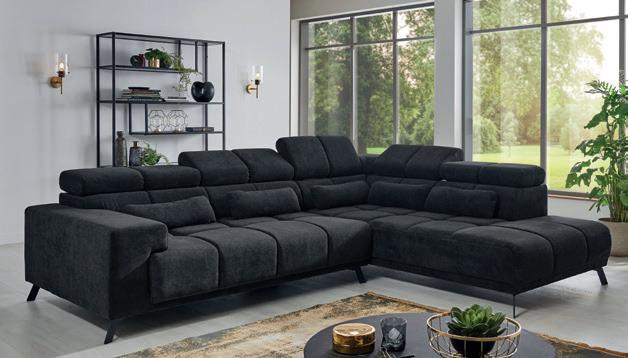 Salon panoramique Inside comprenant: 1 canapé 2 places à gauche avec réglage du siège électrique, 1 méridienne à droite, avec réglage du appuie-tête, avec rembourrage à ressorts Bonell, avec coussins, encombrement env. 232 x 295 cm, couchage env. 105 x 217 cm, tissu anthracite, pieds métal noir à ressorts