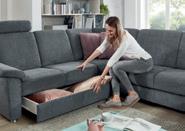 comprenant: 1 canapé 2 places avec fonction convertible à gauche, 1 récamiere coffre à literie à droite, avec réglage du appuie-tête, suspension Nosag, dossier réelle, encombrement env. 262 x 214 cm, couchage env. 195 x 124 cm, tissu gris 0415007105