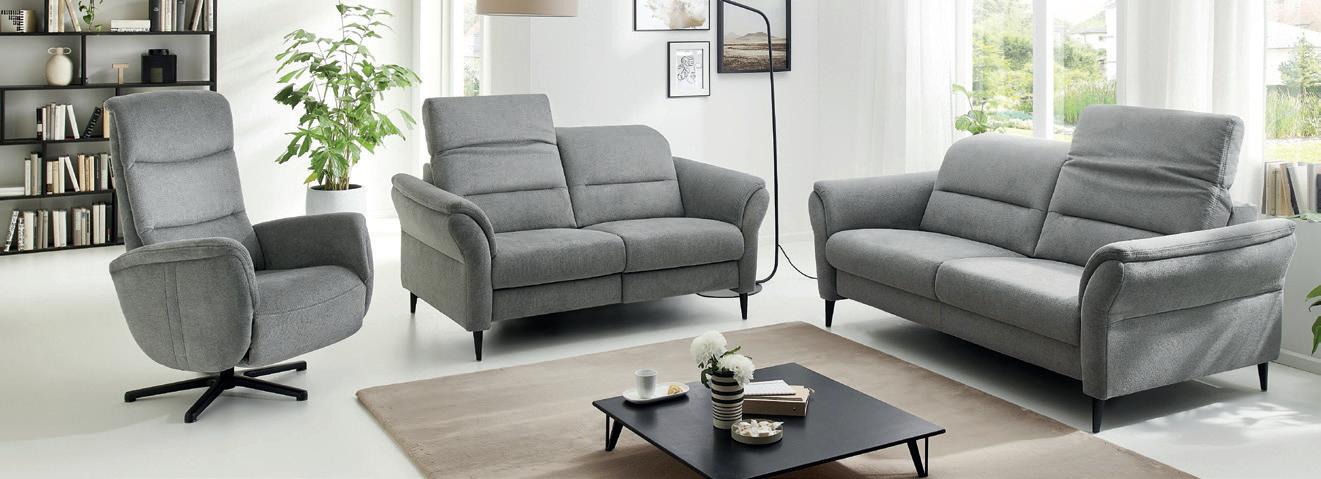 avec réglage du siège électrique Salon panoramique Speed comprenant: 1 canapé 2 places à gauche, 1 méridienne à droite, avec rembourrage à ressorts Bonell, avec coussins, encombrement env. 285 x 201 cm, couchage env. 105 x 222 cm, tissu gris 1018002000