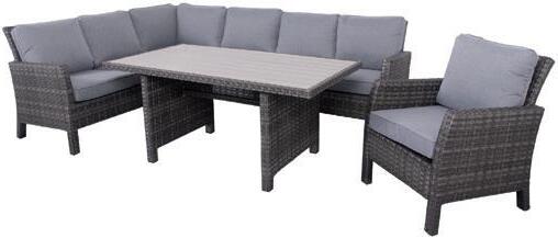 Mobiler de jardin Beach optique rotin gris, comprenant: 1 table L/H/P env. 150/85/67 cm, 1 canapé 3 places avec accoudoir à gauche, L/H/P env. 182/85/82 cm, 1 canapé 2 places avec accoudoir à droite, avec angle, L/H/P env. 201/85/82 cm, avec coussins 0294003600