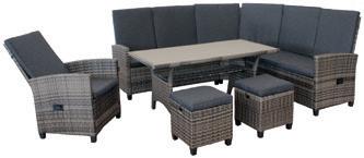 Ecklounge Antwerpen Kunststoffrattan braun mit Sitzauflagen, bestehend aus: 1 x Eckbank linker und rechter Sitz verstellbar, 1 x Sessel, 2 x Hocker, 1 x Tisch 0273000300 36 x mtl ab 25,-* oder 799,99