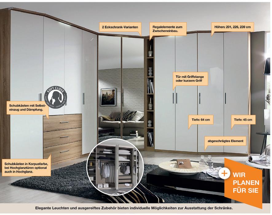 Drehtürenschranksystem mit Regalen, auch über Eck Ein Kleiderschrank mit Drehtüren, der sich mit System perfekt in ihre Raumgegebenheiten einfügt: das ist Dimension-5. Die Drehtürenschränke lassen sich durch einfaches Anbauen einzelner Schrankelemente individuell arrangieren und passen sich, dank Eckelementen, Regalen zum Zwischeneinbau und der Option Maßanfertigung, spielend leicht an jedes Raumkonzept an. Passende Beimöbel und Betten bestechen mit einer umfangreichen Typen-, Material- & Farbauswahl und harmonieren perfekt mit den Schränken.