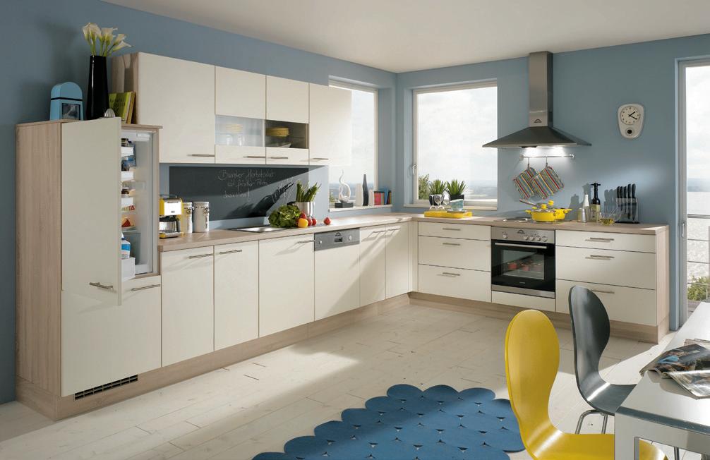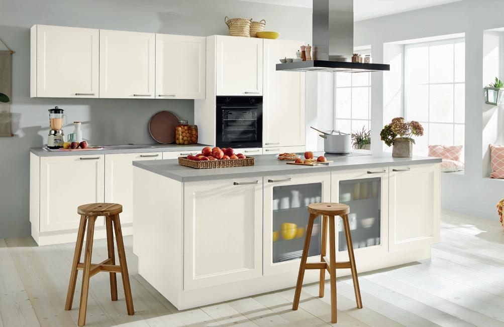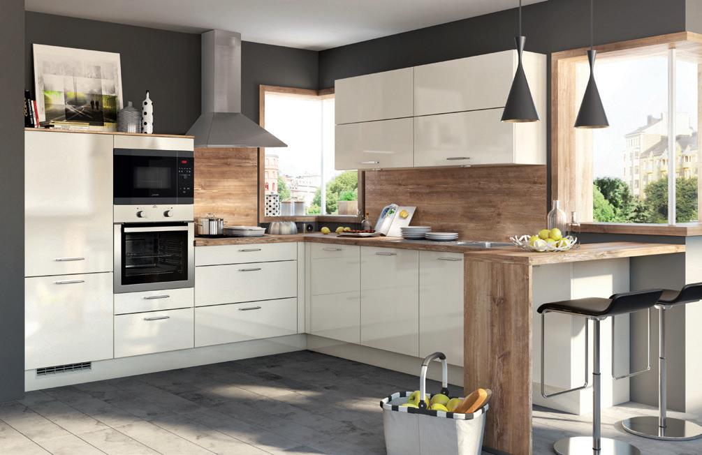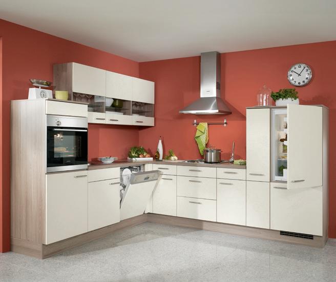 Preisgleich in 6 Frontfarben lieferbar 3 Eckküche Clean, ca. 305 x 185 cm, Lack matt Magnolia inkl. Glaskeramikkochfeld Respekta KM4400-28 inkl. Backofen Respekta AB120-26
