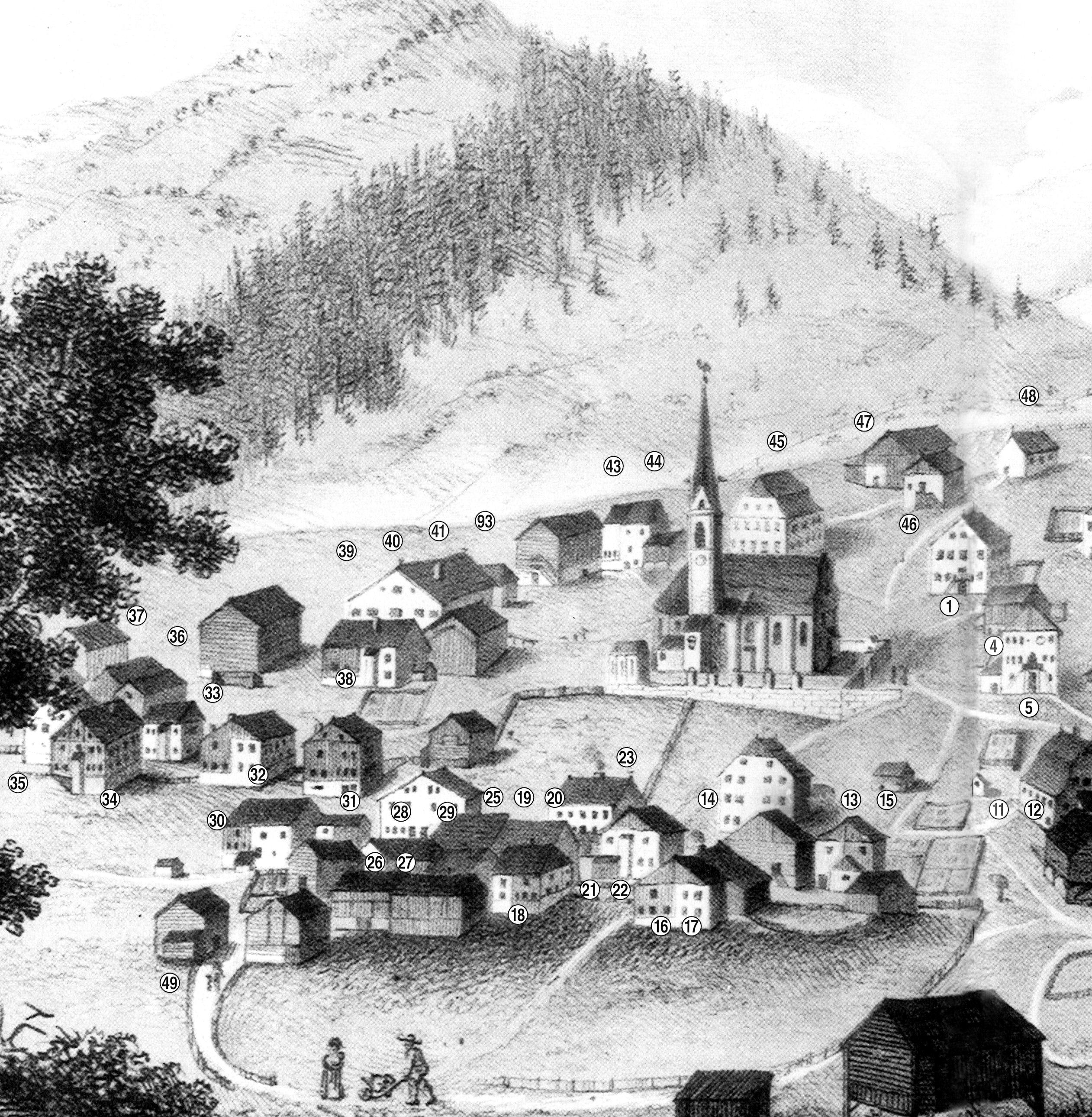 Ischgl um 1830. Die Hausnummern 28 und 29 gehörten zum sogenannten Stiegenhaus.