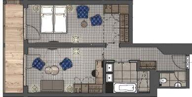 mit Wohn- und Schlafraum, Luxusbad mit Badewanne & Dusche, WC & Bidet getrennt, Fön, Badetasche mit Bademäntel, begehbarer Schrankraum, Flat TV im Wohnraum & Badezimmer, Blu-ray-Player, Telefon, Radio,