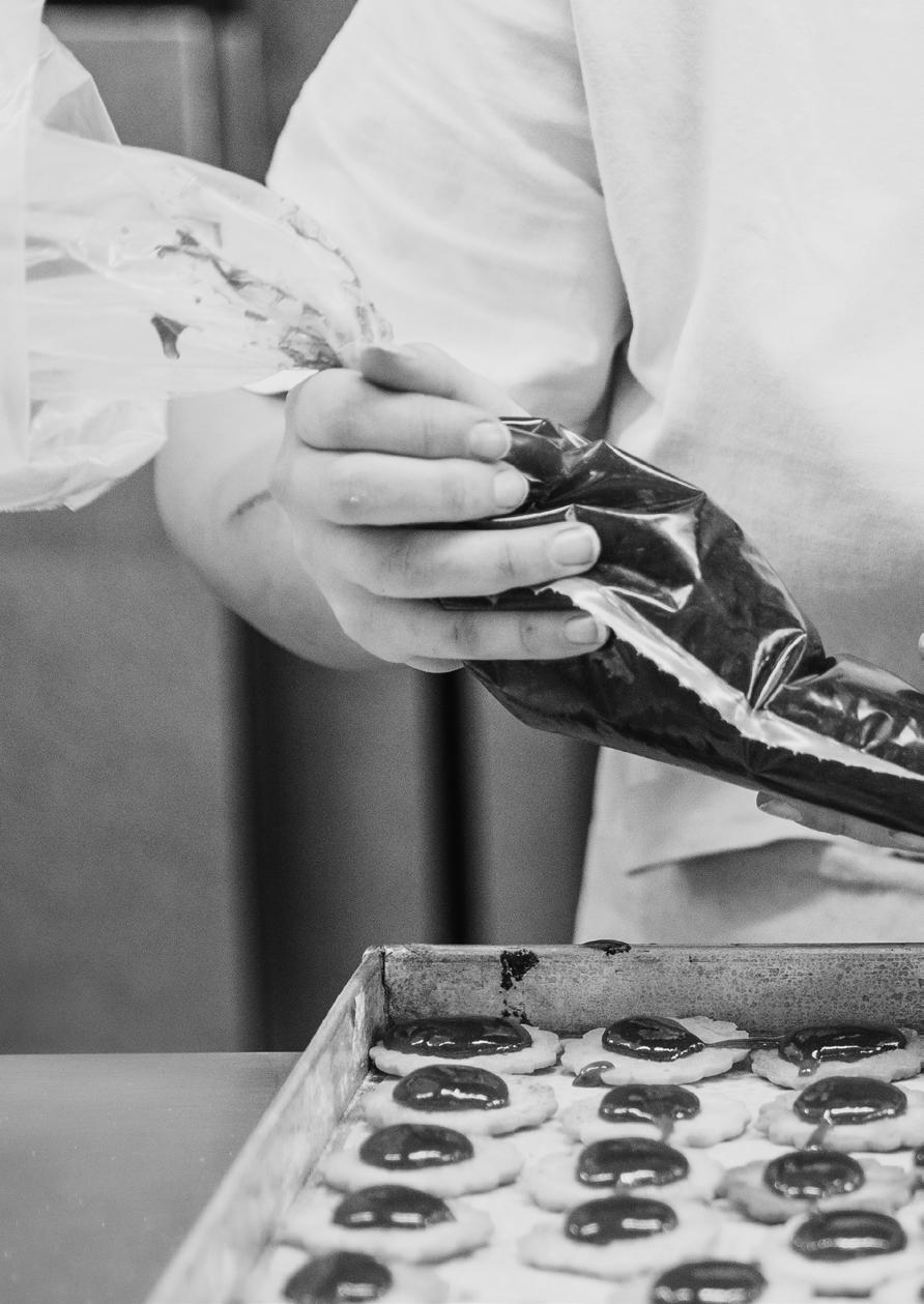 Es ist eine Welt, die sich viel bunter anfühlt als sie aussieht: In der Backstube oberhalb der Hauptfiliale dudelt Popmusik, Maschinen summen, Töpfe klappern und duftet es wunderbar nach geschmolzener Schokolade. Zwischen Rührschüsseln und Backöfen bewegt sich das Team fast wie in einer Choreografie: abwiegen, rühren, kneten, modellieren, Ofentür auf – neue Köstlichkeit raus. Dazwischen winkt auch mal ein Hüftschwung, wenn gerade keine Millimeterarbeit ansteht. Ganz klar: Hier sind junge Konditorinnen am Werk, die ihren Beruf lieben! Mit Leidenschaft zaubern die Gesellinnen und Lehrlinge all das, was Kunden von Kurz so glücklich macht: klassische Torten, Kuchen, Desserts und feines Sandgebäck, im Sommer hausgemachtes Eis. Zu Weihnachten und Ostern wird das Sortiment um saisonale Highlights erweitert, auch für spezielle Anlässe wie Hochzeiten (siehe Seite xxx) entstehen wahre Kunstwerke.