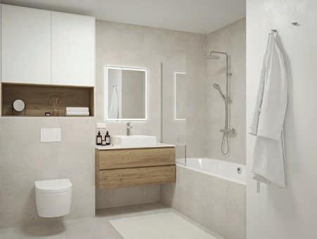 Die Badezimmer sind mit beigem Feinsteinzeug und einem Spiegel mit LED-Beleuchtung ausgestattet. Bei der Ausstattung wird auf höchste Qualität geachtet, so kommen Waschbecken von Laufen und Armaturen von Hans Grohe zum Einsatz (oder gleichwertig). Farbvarianten beim Feinsteinzeug und bei den Armaturen sind auf Sonderwunsch möglich.