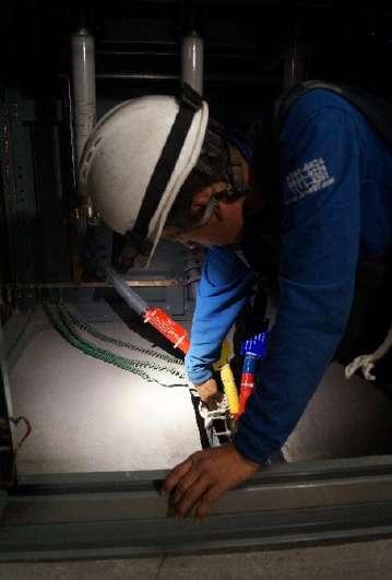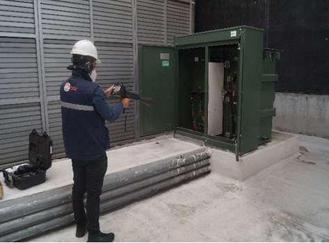 Se realiza la apertura de los desconectadores en aire que protegen a los Transformadores de 300 y 500 kVA, correspondiente al servicio de Áreas comunes y Servicios Generales. Previo a realizar el mantenimiento a la Subestación Eléctrica, se verifica la ausencia de potencial para posteriormente proceder a la descarga de los equipos de Media Tensión.