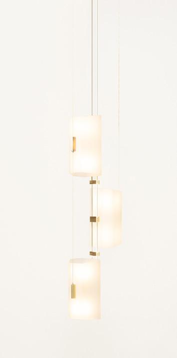 The Alice collection is inspired by brutalist modular architecture. The textured hand blown glass cubes are sandblasted to create a soft glow. The frame is made of solid brass
