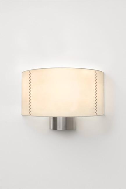 Generously scaled parchment lampshades are secured by hand-stitched leather lacework, emitting a soft light that washes over its hand finished brass hardware. Available in both Tall and Wide configurations.