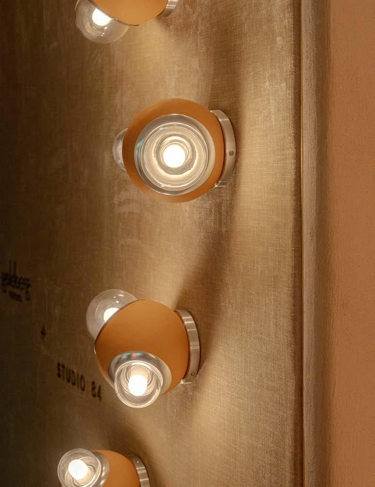 La familia presenta un AURA de luz en sus tres diferentes modelos. En los cuales se incluyen una luminaria colgante que emite un cálido y uniforme resplandor por medio de su difusor, seguido por una lámpara arbotante que transmite la luz como un destello radial y una lámpara de mesa que la esparce creando un contraste entre sus dos lunas de acero porcelanizado.