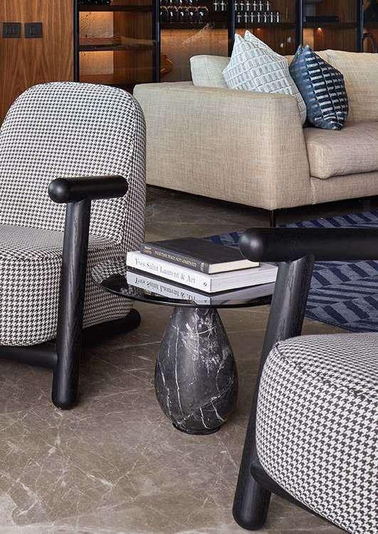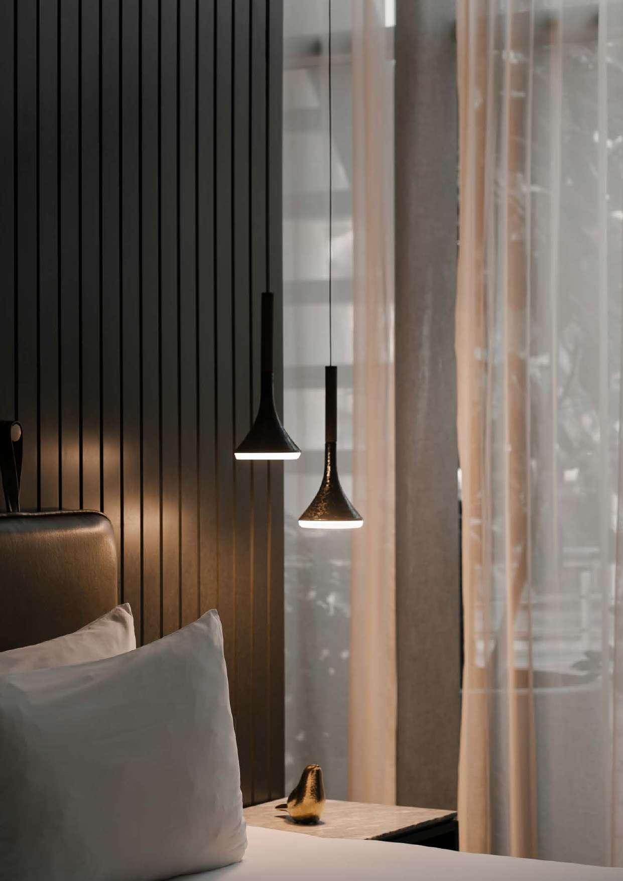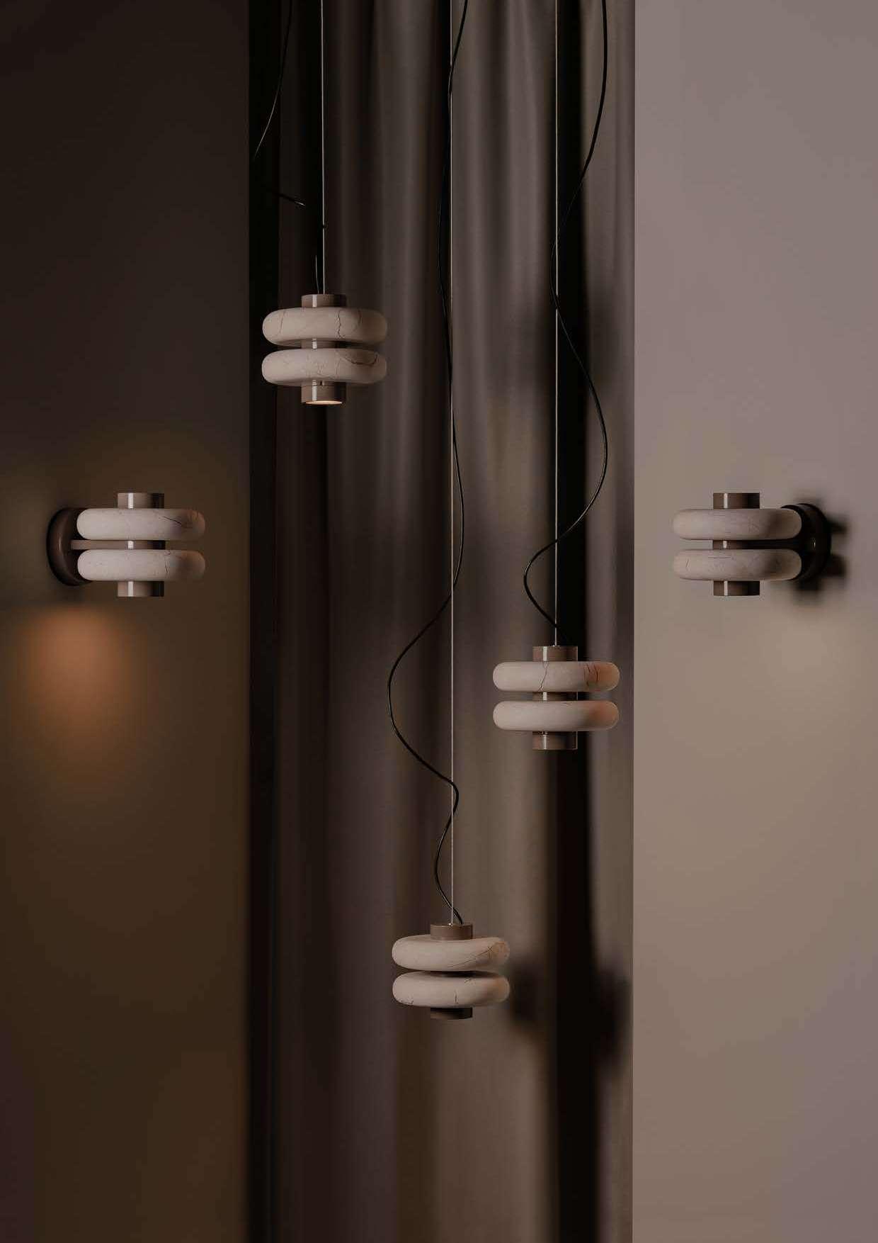 Las luminarias fusionan la solidez del mármol con la suavidad de una forma equilibrada y simétrica proyectando una luz puntual y cálida.
