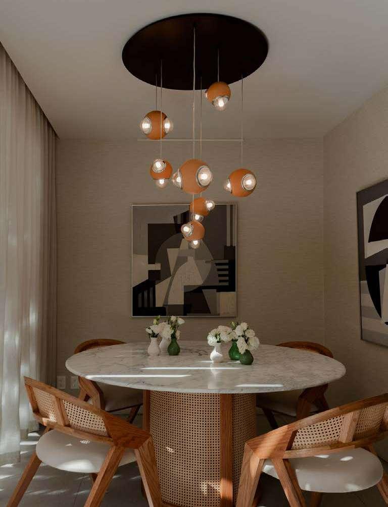 La familia presenta un AURA de luz en sus tres diferentes modelos. En los cuales se incluyen una luminaria colgante que emite un cálido y uniforme resplandor por medio de su difusor, seguido por una lámpara arbotante que transmite la luz como un destello radial y una lámpara de mesa que la esparce creando un contraste entre sus dos lunas de acero porcelanizado.