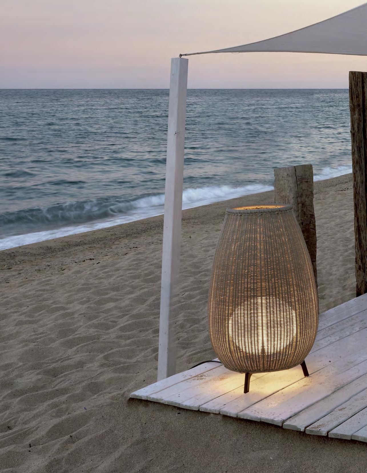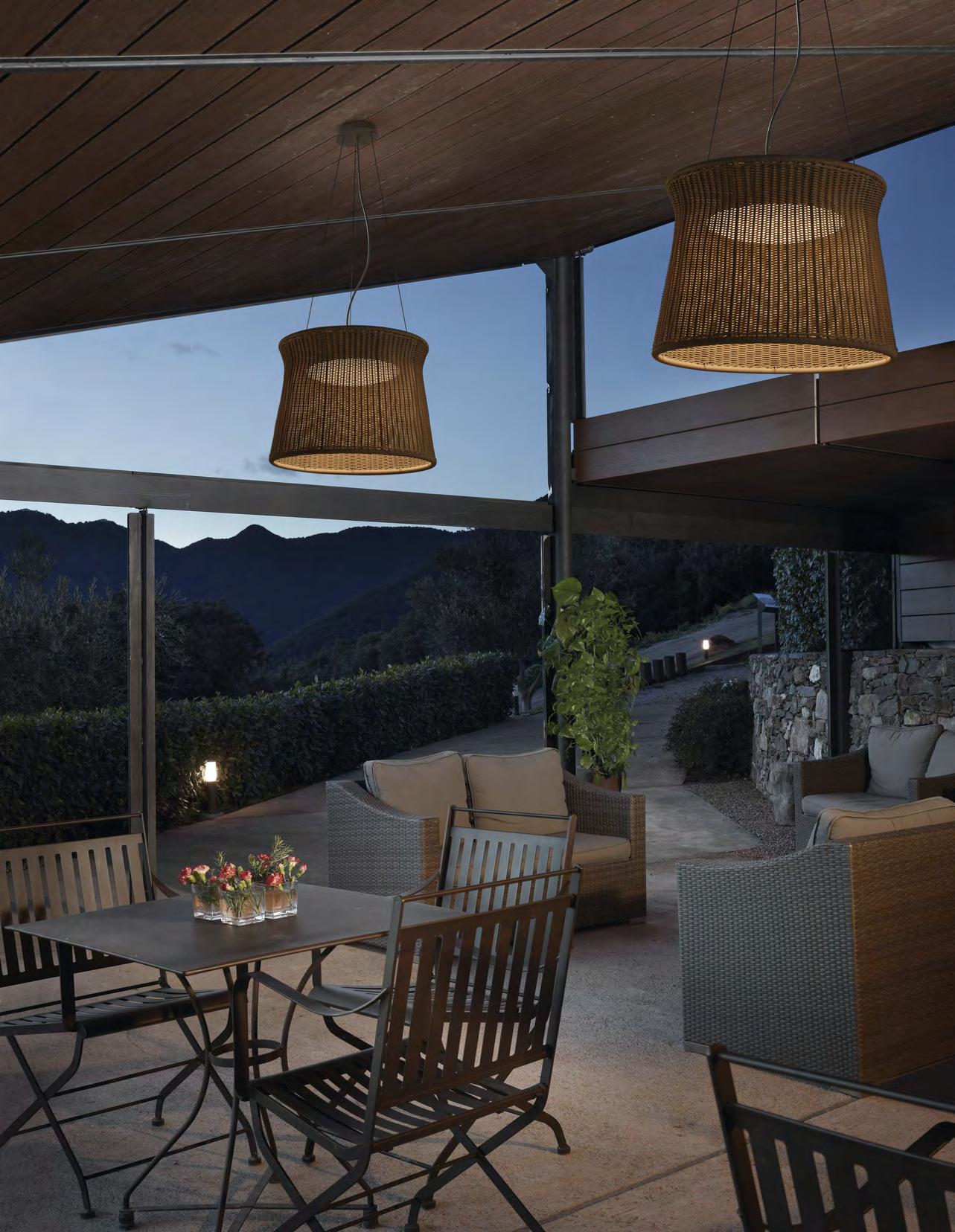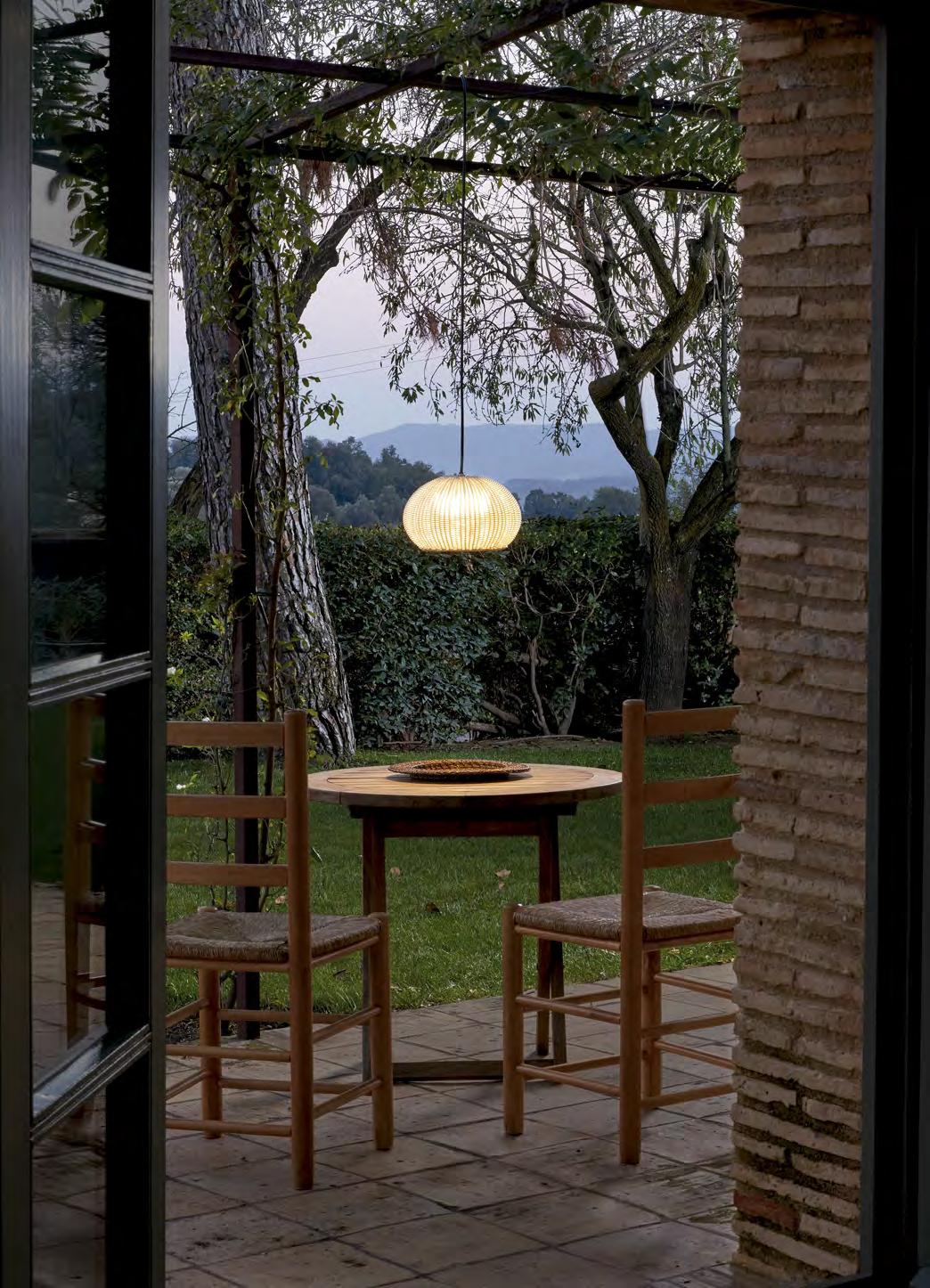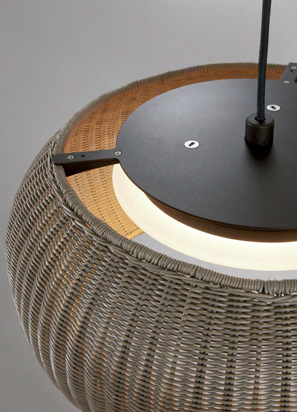 El denominador común de esta colección es la combinación de resistencia y sensibilidad. Resistencia ya que está diseñada para poder vivir cómodamente a la intemperie, y sensibilidad expresada en la delicadeza con que tamiza la luz y la calidez general de la lámpara. Estas características hacen que tanto dentro como fuera de un espacio arquitectónico, ayuden a crear una sensación de continuidad.
