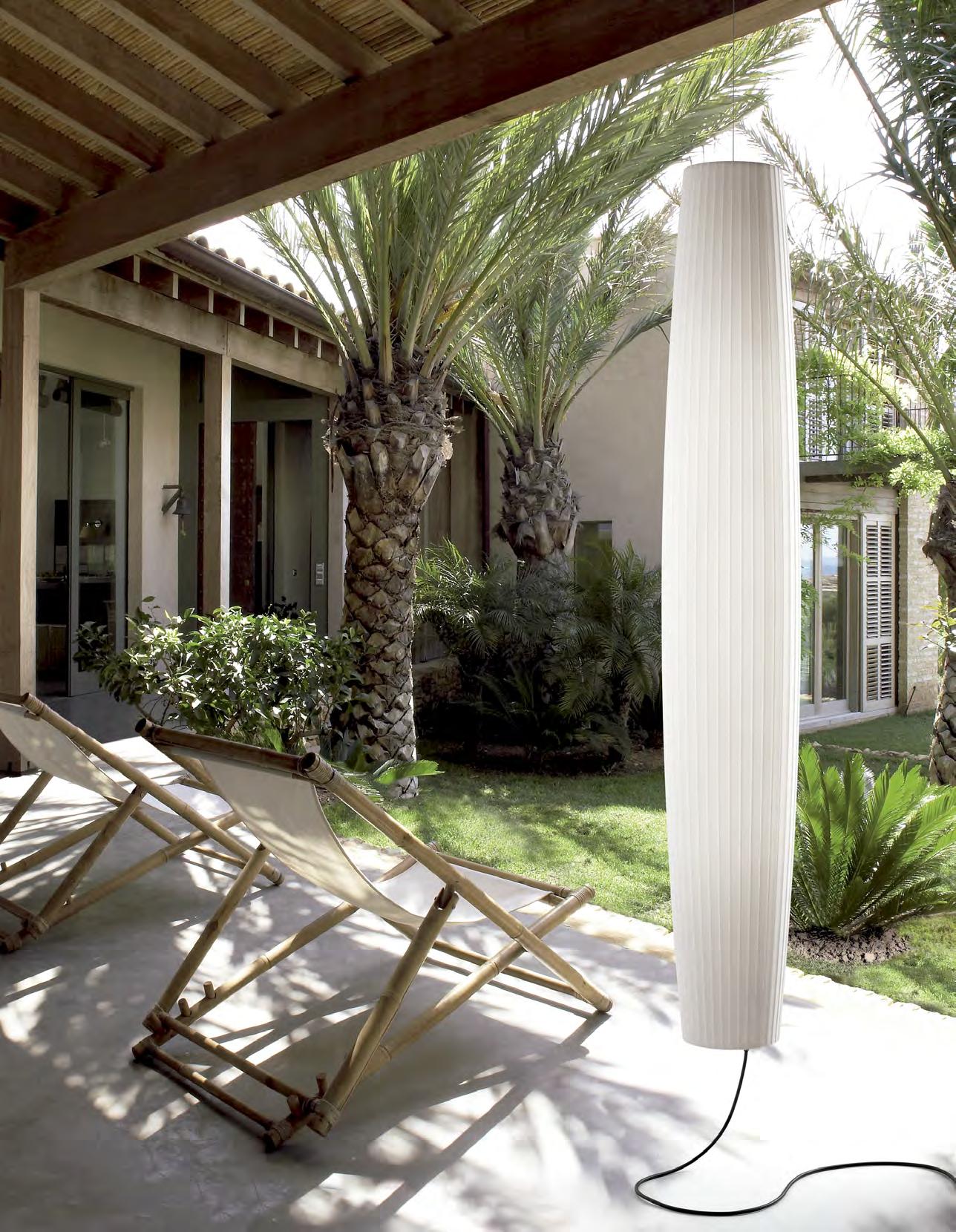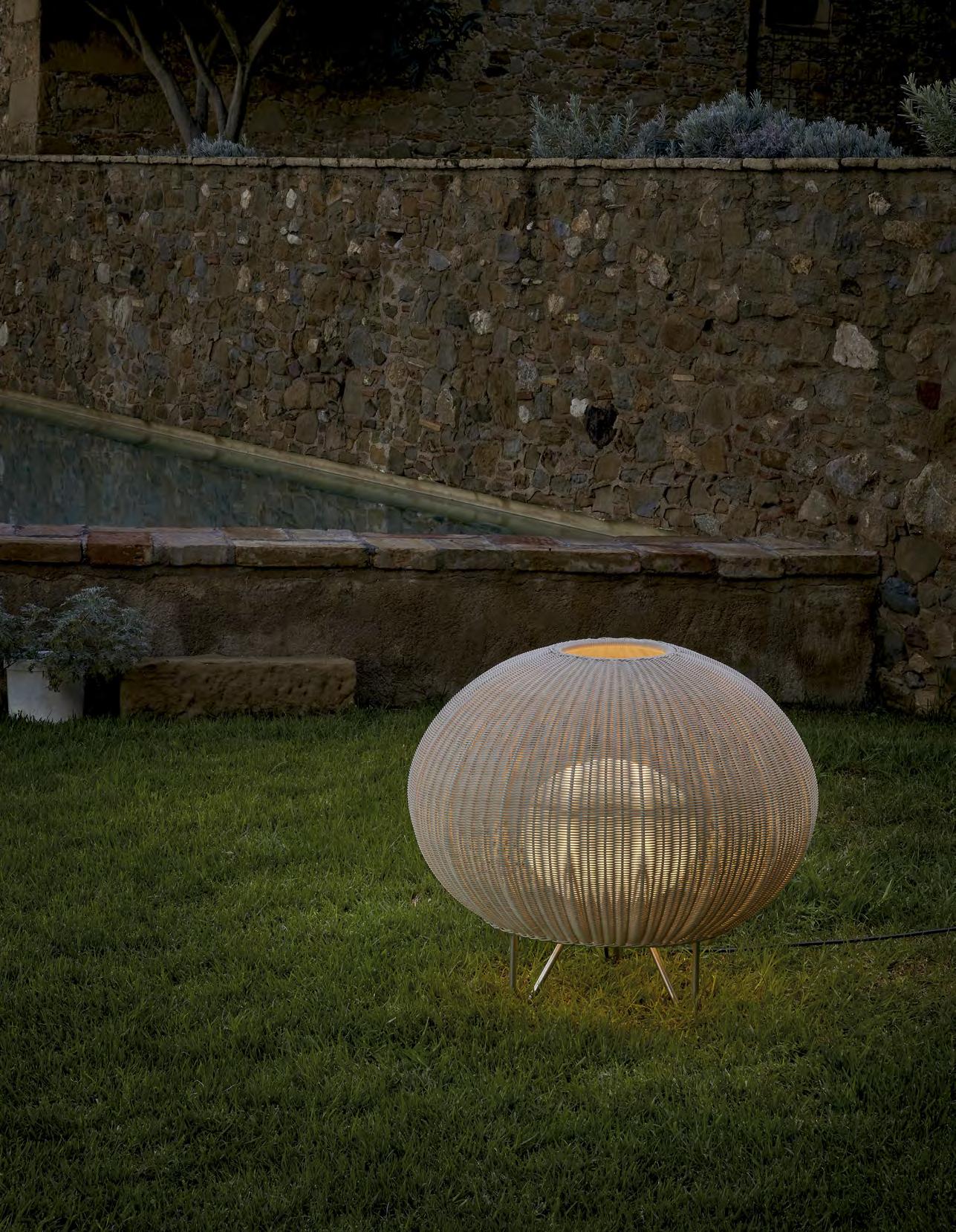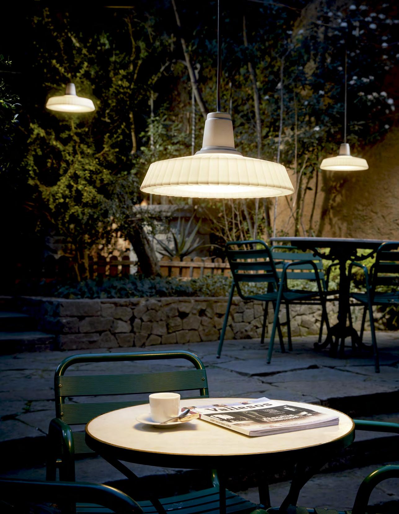 This collection’s common denominator is the combination of resistance and sensitivity. Resistance because it is designed to be able to stay happily outdoors, and its sensitivity shows in the delicacy with which it filters the light and the overall warmth of the lamp. These features help to create a sense of continuity both on the inside and outside of an architectural space.