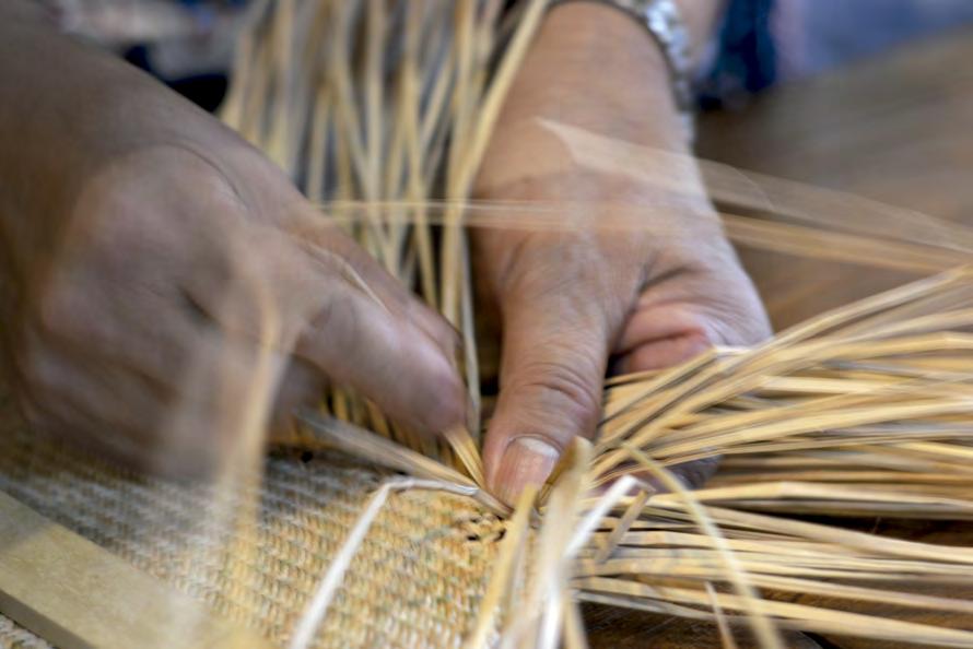 La pantalla de la Nans S/55, está tejida a mano con una trama más elaborada, que combina distintos modos de tejer la fibra en un mismo plano.