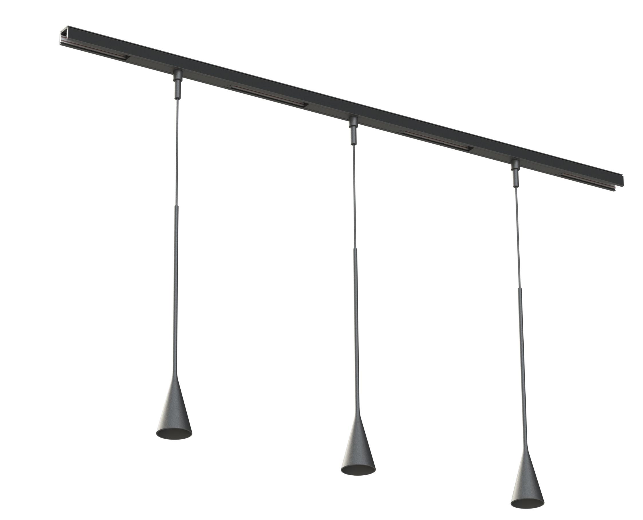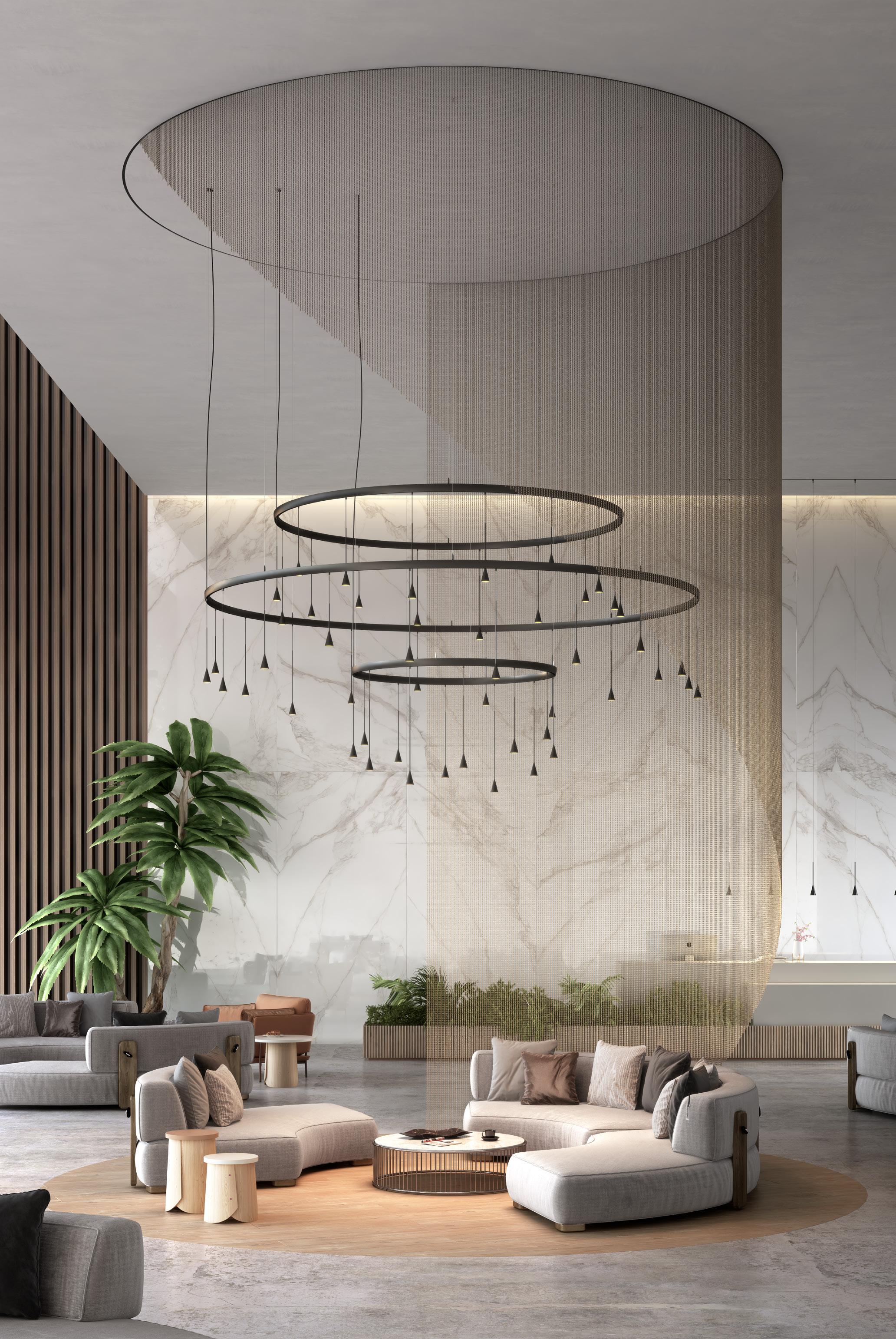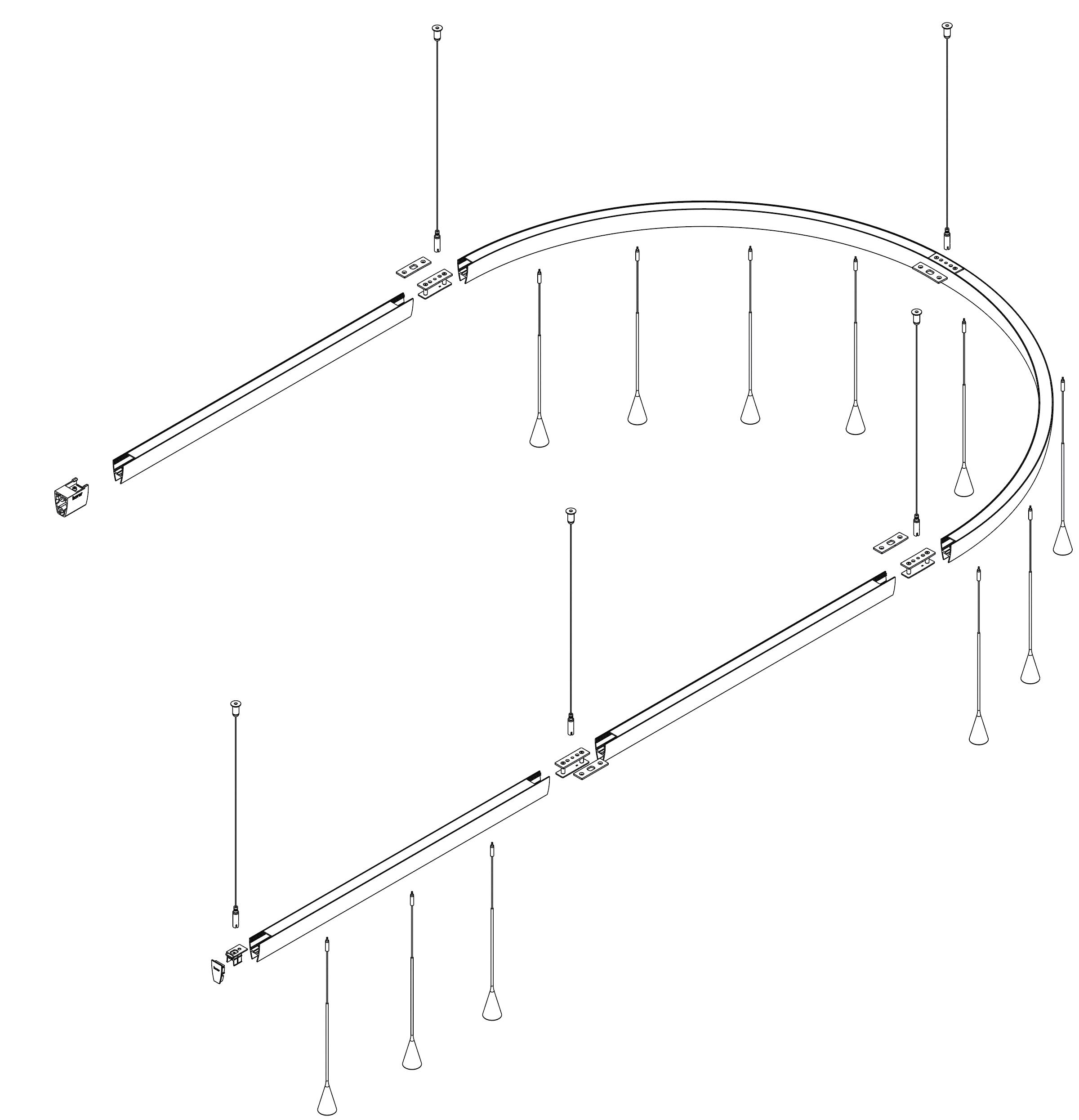 The tracks are made from extruded aluminum and in both the linear and circular versions, the profile is suspended by height-adjustable tension cables or can be mounted directly to the ceiling.