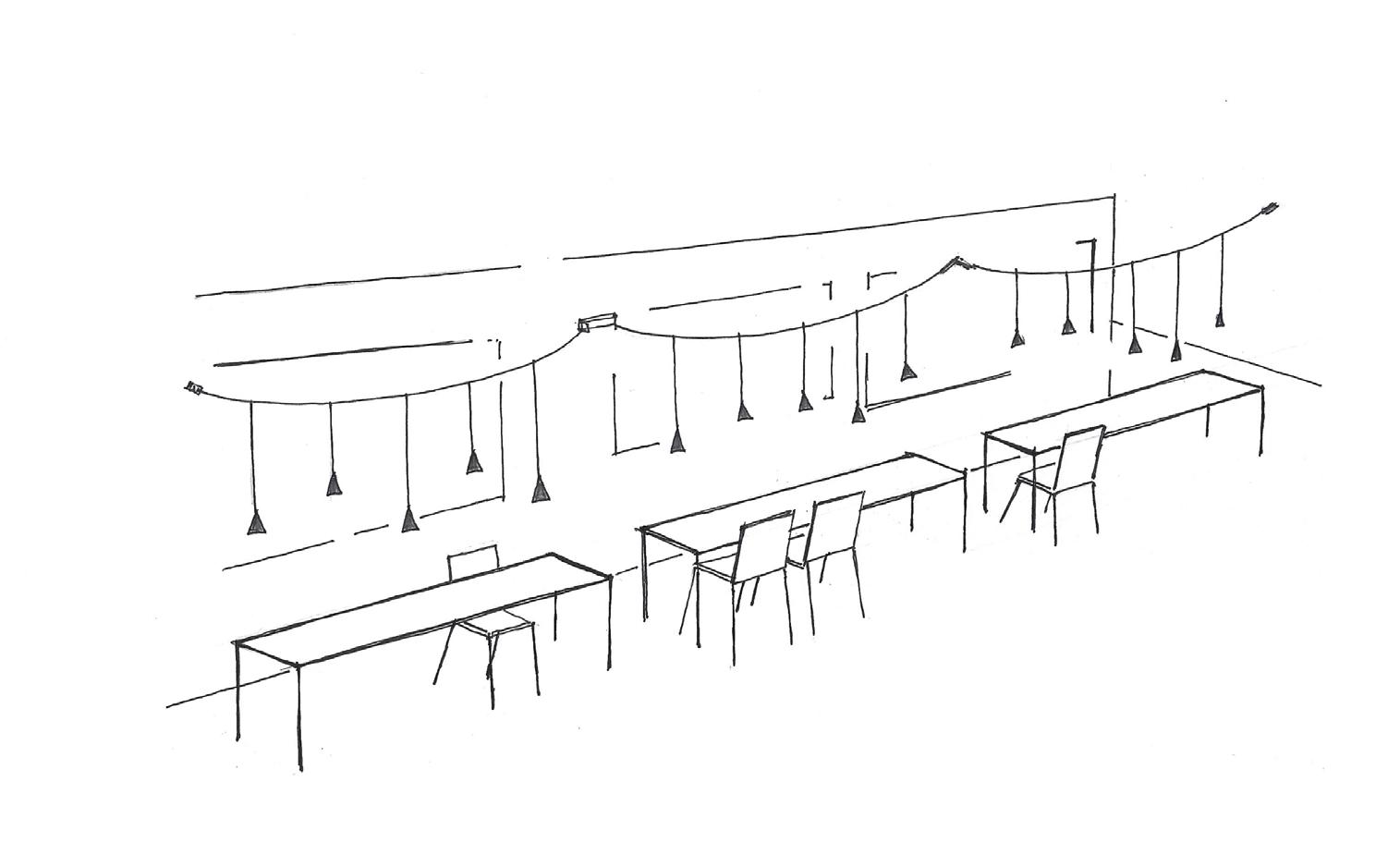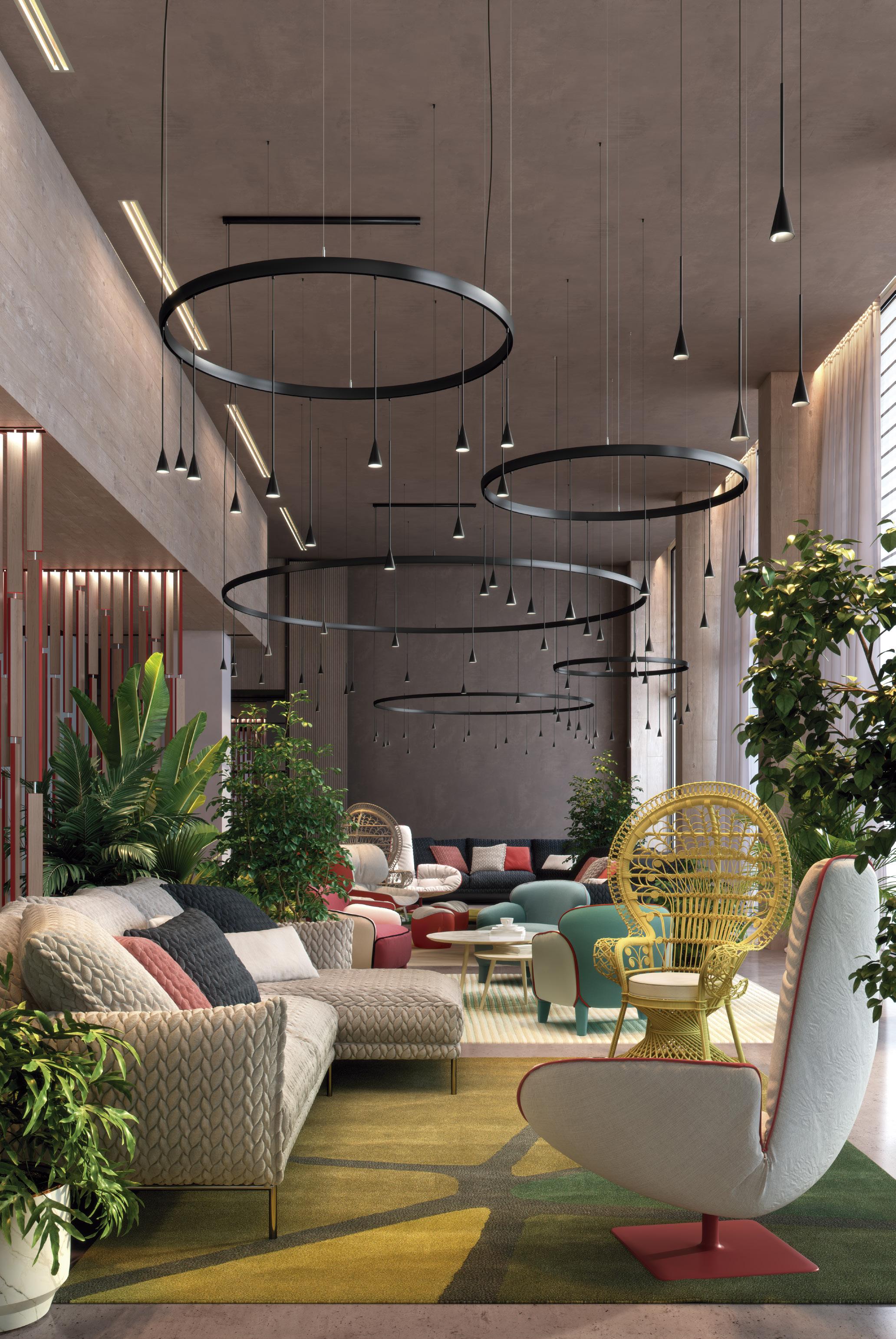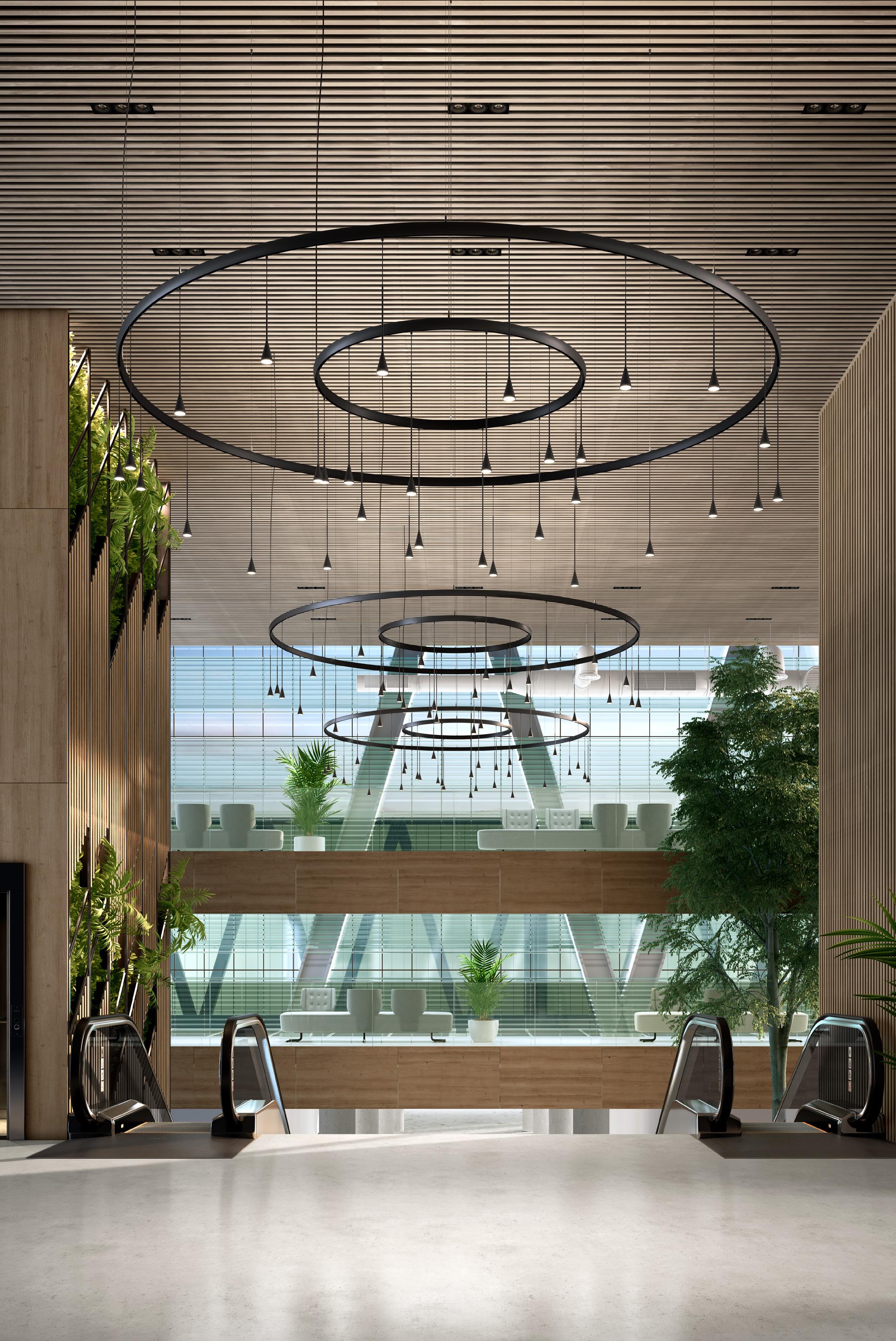 The tracks are made from extruded aluminum and in both the linear and circular versions, the profile is suspended by height-adjustable tension cables or can be mounted directly to the ceiling.