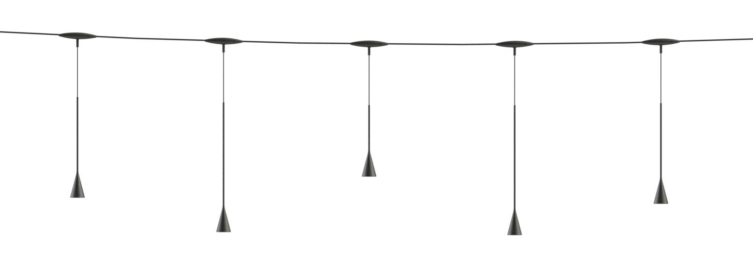 Catenaria Skybell, incorpora Connection Core con PCB de interconexión de línea en serie. Conector Jack de 3,5mm con retención mecánica para fijación de luminaria. Cable de seguridad interno. Color negro.