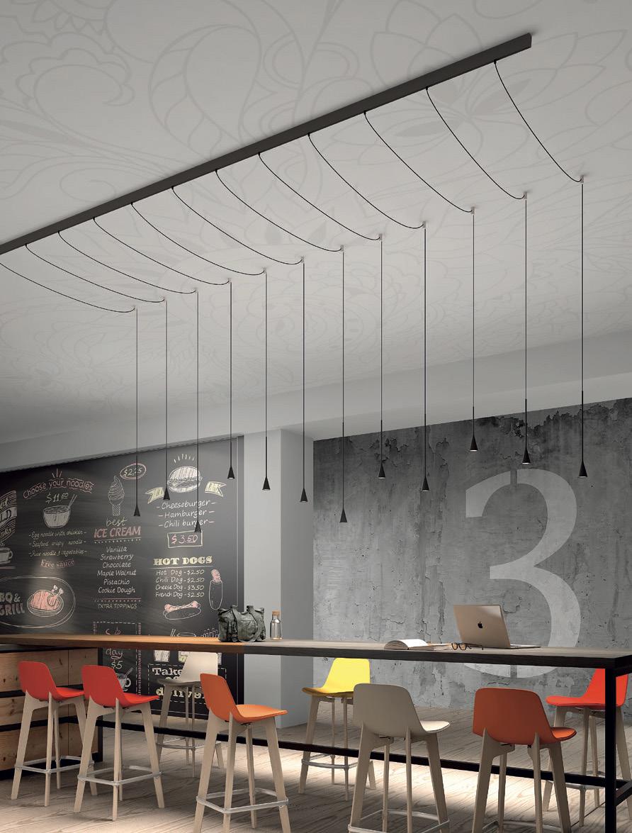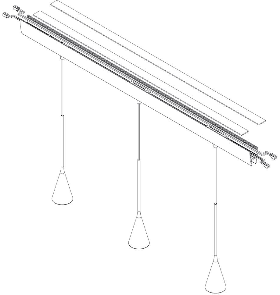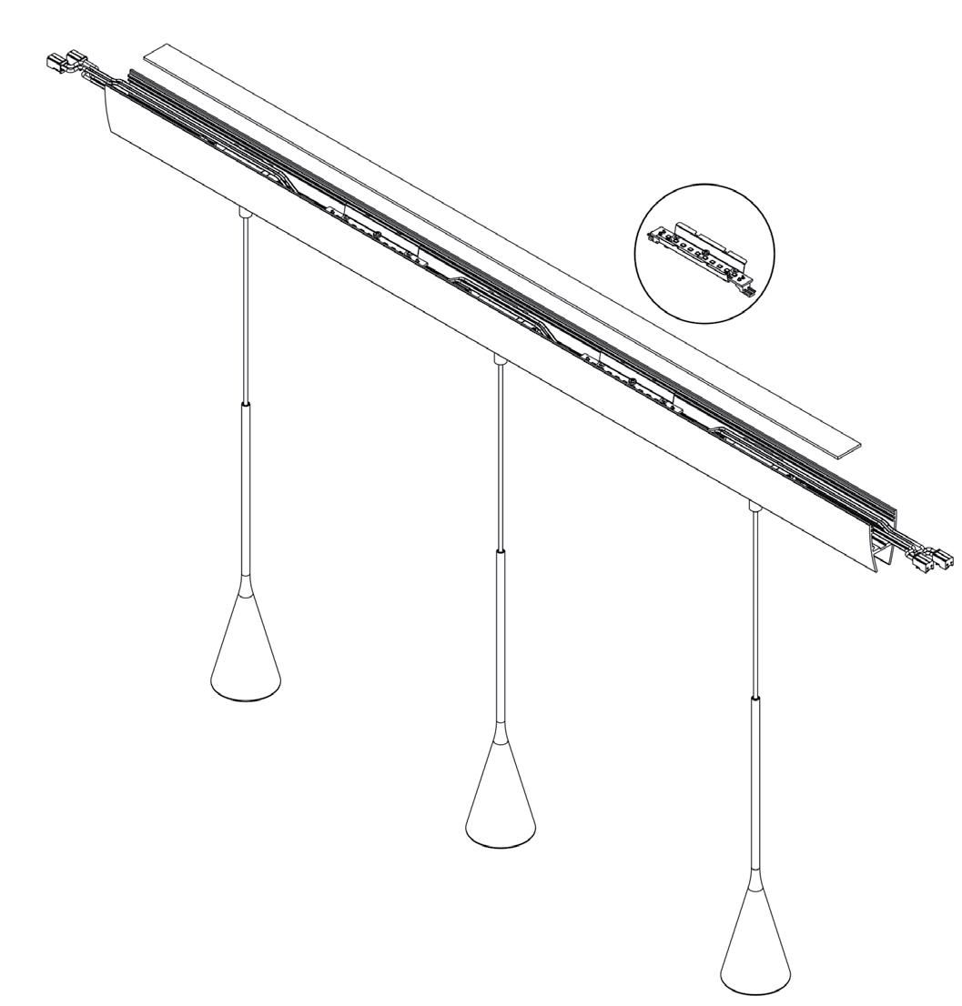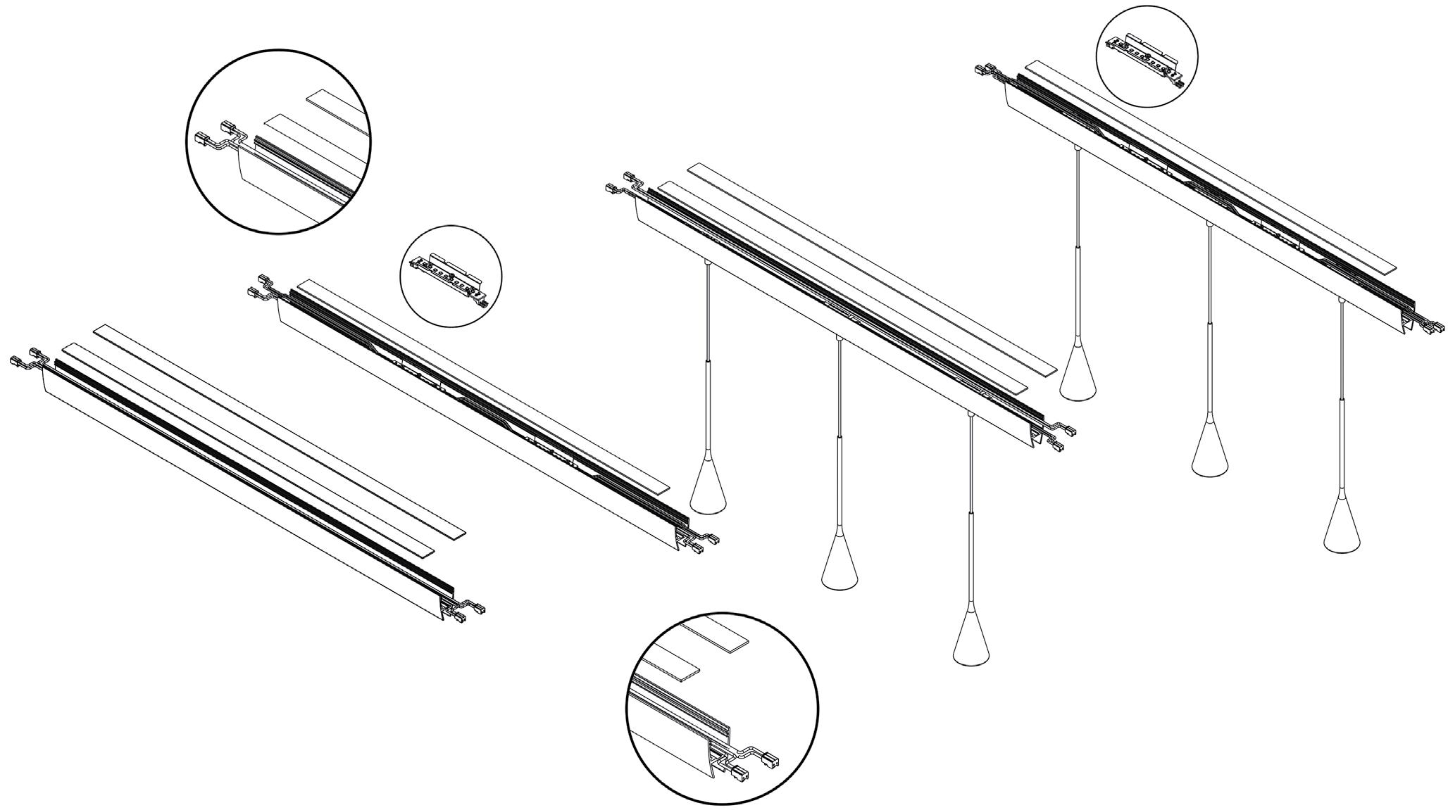 Los perfiles están realizados en aluminio extrusionado y tanto en la versión lineal como en la circular, el perfil está suspendido por cables tensores regulables en altura o directo a techo.