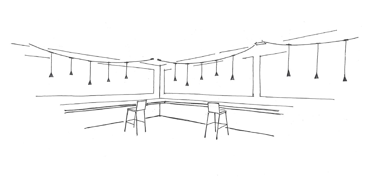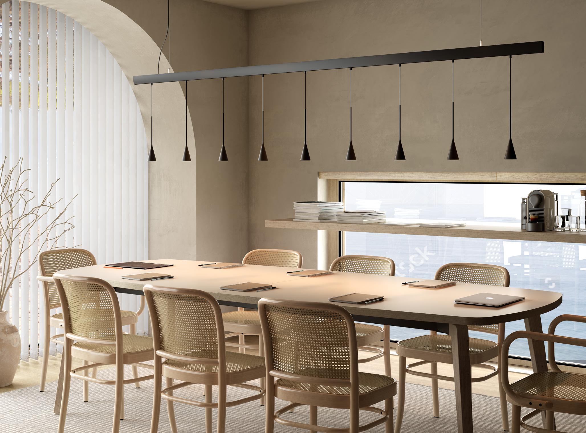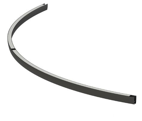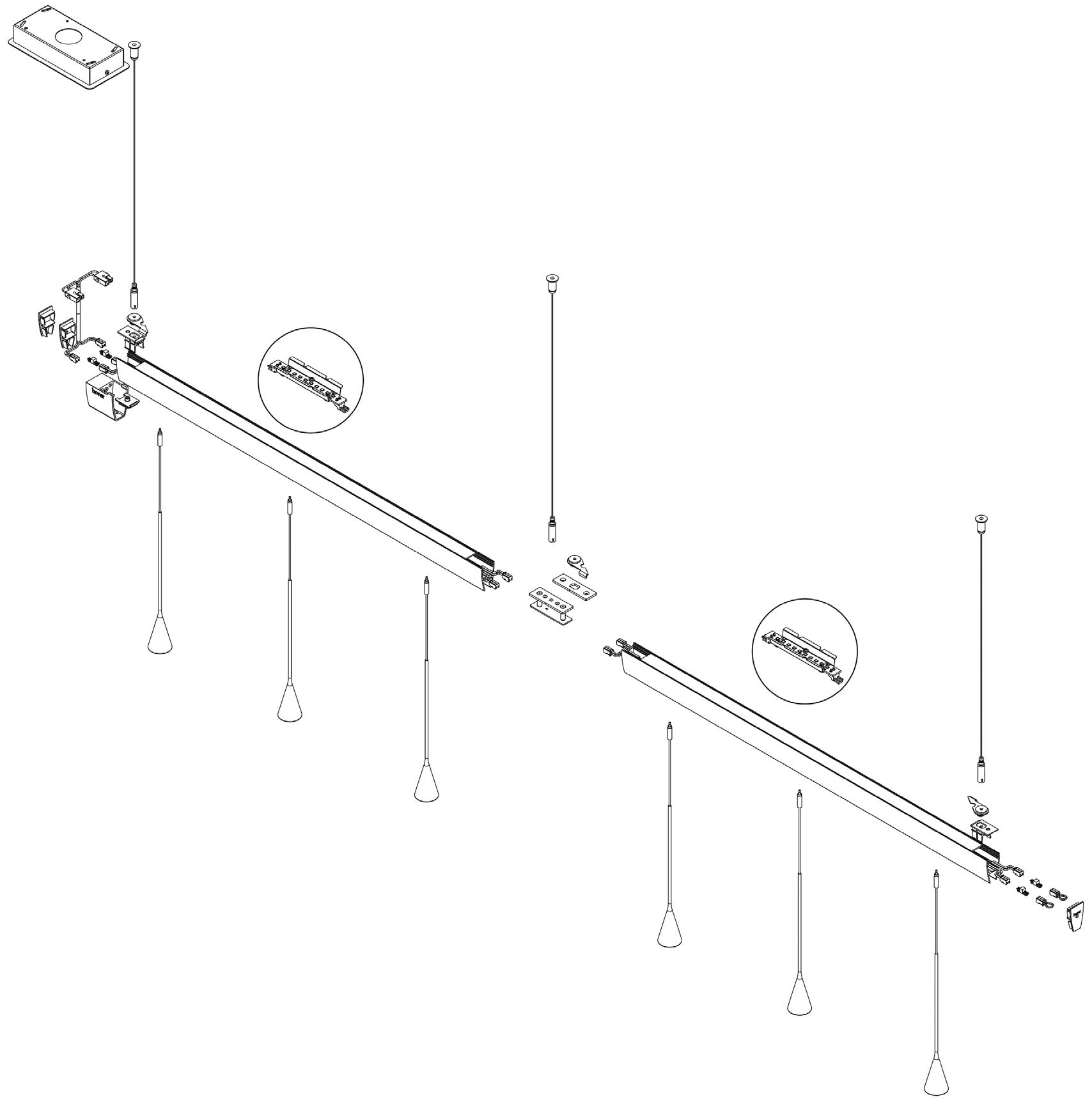 Los perfiles están realizados en aluminio extrusionado y tanto en la versión lineal como en la circular, el perfil está suspendido por cables tensores regulables en altura o directo a techo.