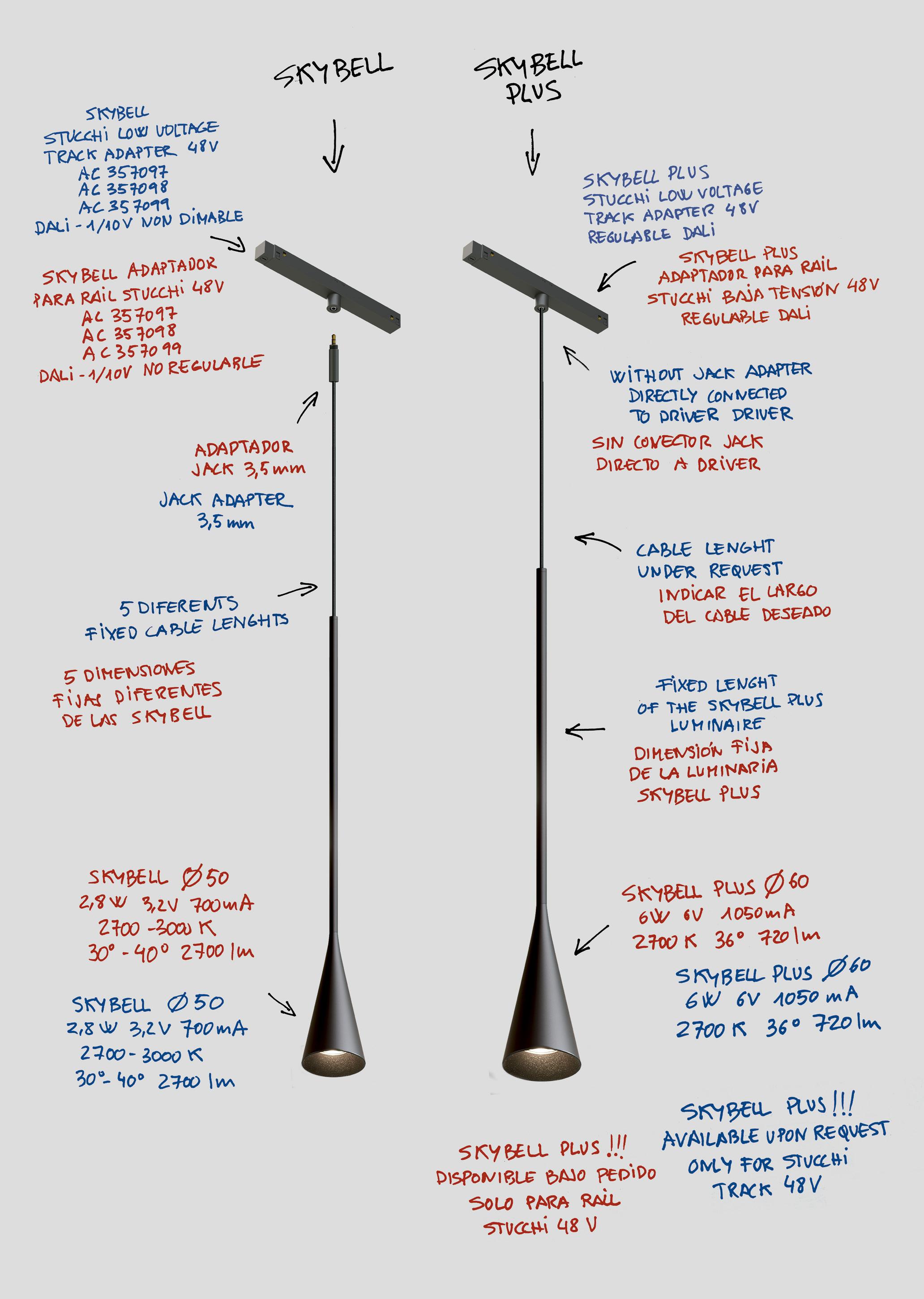 Las Skybell se dividen en 3 grupos (Catenarias, Perfiles y Circulares) claramente diferenciables y debido a las distintas posibilidades que nos ofrecen, cada uno de estos grupos forma una familia en sí misma.