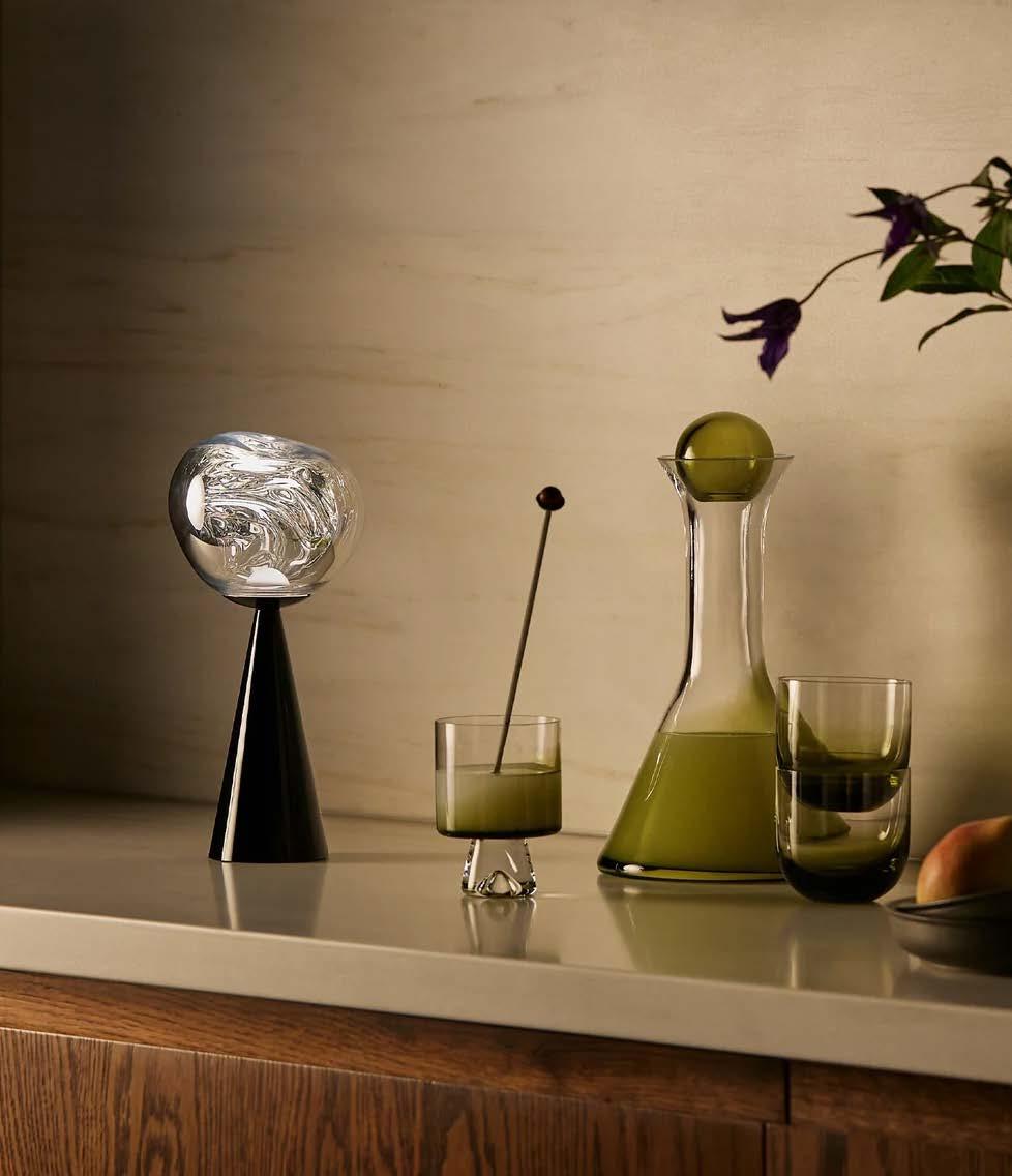 La lámpara led portátil Melt amplía la colección, ofreciendo el mismo efecto hipnótico de vidrio soplado de la pieza inicial en un diseño sin cables. Melt evoca el vidrio fundido, el interior de un glaciar derritiéndose o imágenes del espacio profundo. Está disponible en una amplia gama de acabados y ofrece hasta diez horas de autonomía.