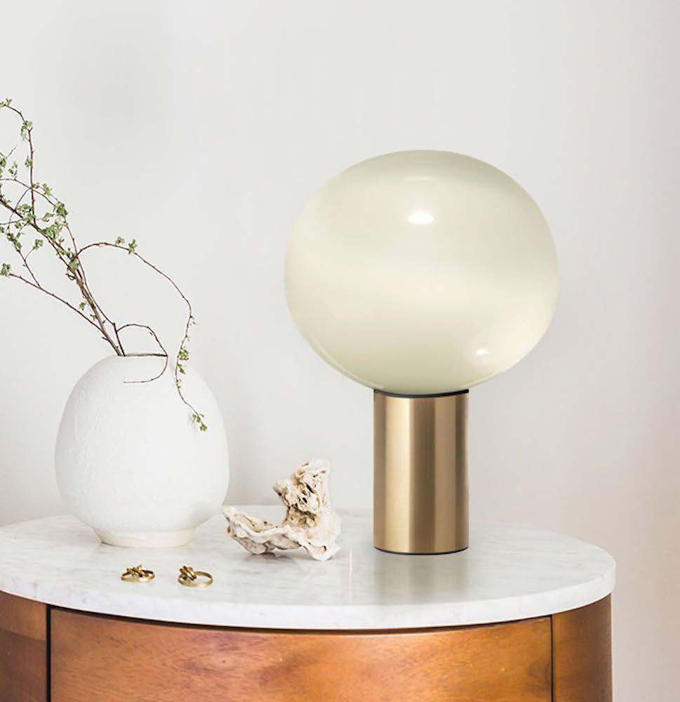 Se forma por una base cilíndrica que aloja la fuente de luz. Sobre ella, un difusor de vidrio soplado blanco y lechoso la difunde suavemente, generando un brillo cálido sobre el entorno, a la vez que más brillante y potente en el resto de la habitación. Elegante y precisa, proporciona una presencia refinada a cualquier espacio.