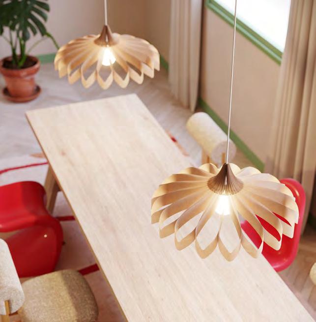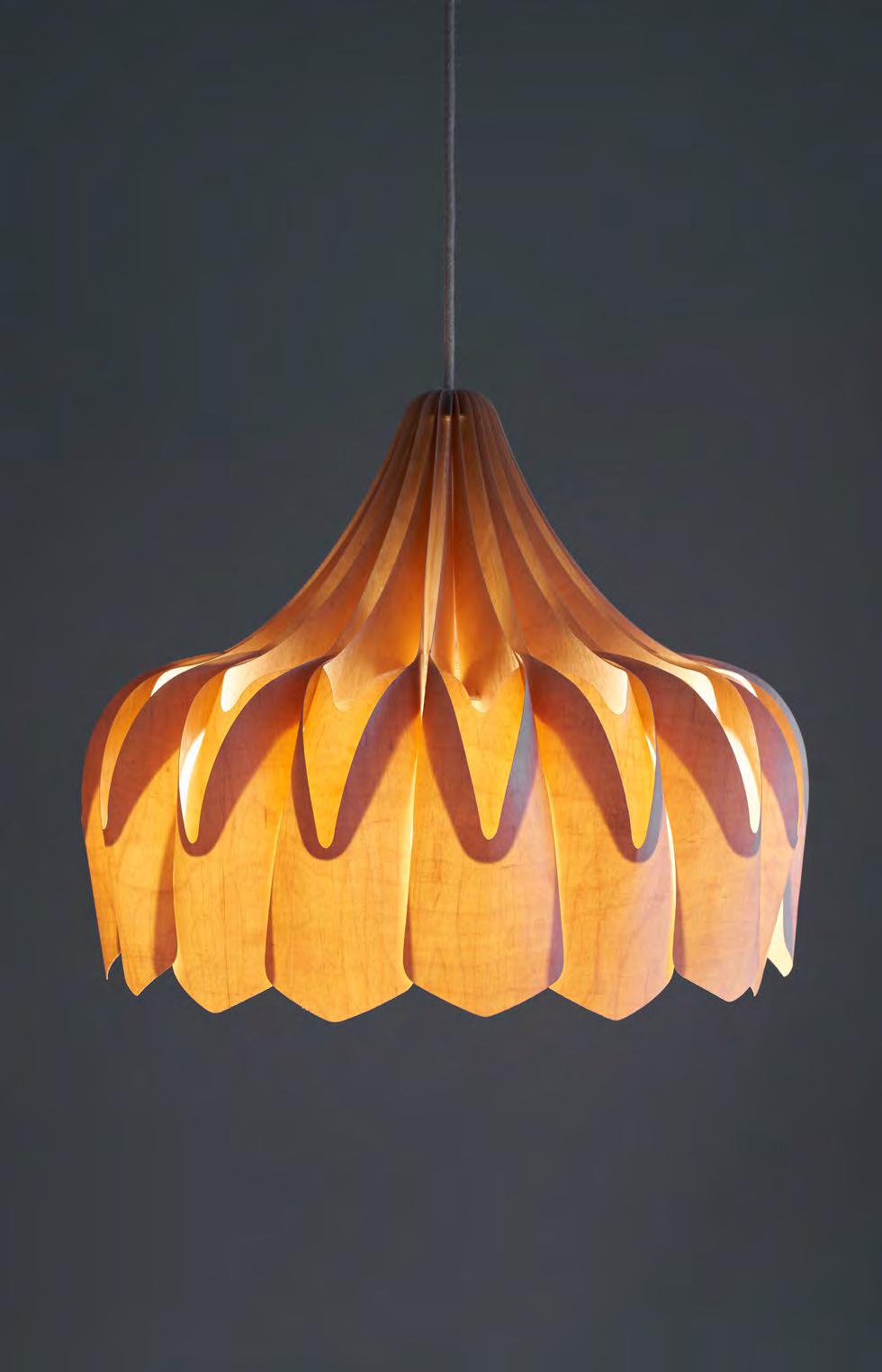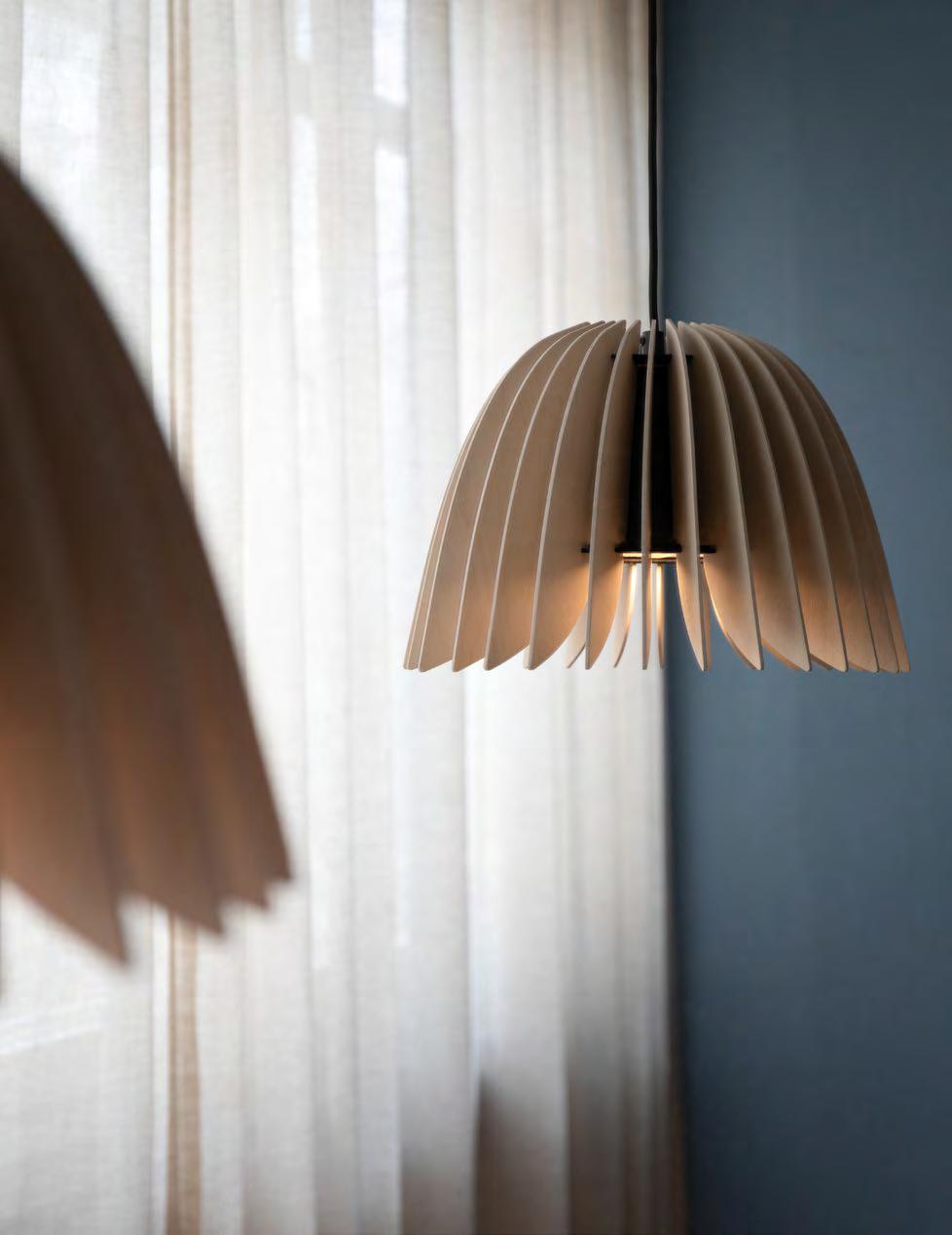 Pioni is a beautiful, organic, flower shaped pendant, creating a natural soft atmosphere in any home or restaurant space. The thin birch plywood is bent into an elegant contemporary form, inspired by nature. It is a balance between soft and strong. The natural, sustainable wood brings warmth and wellbeing to your life. Handcrafted in Finland and assembled without using any glue or screws.
