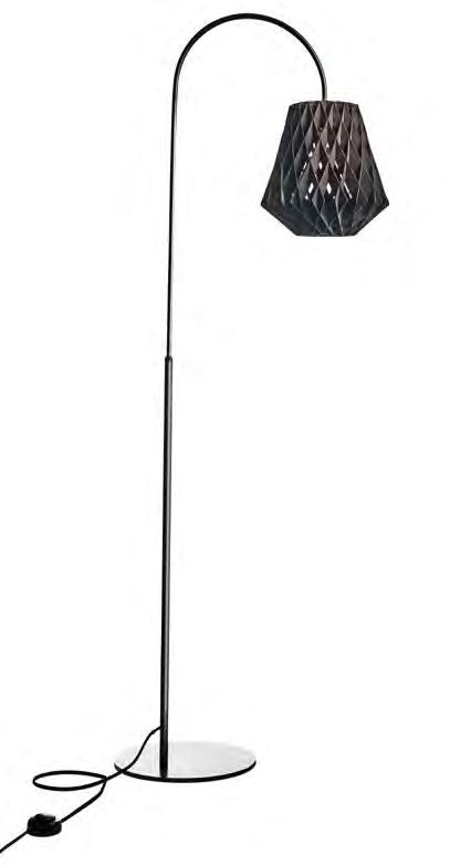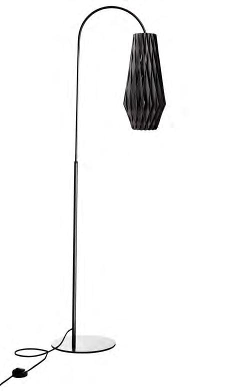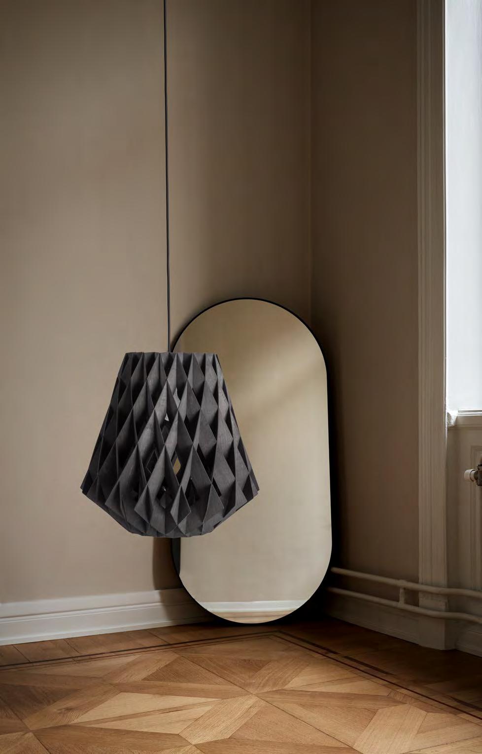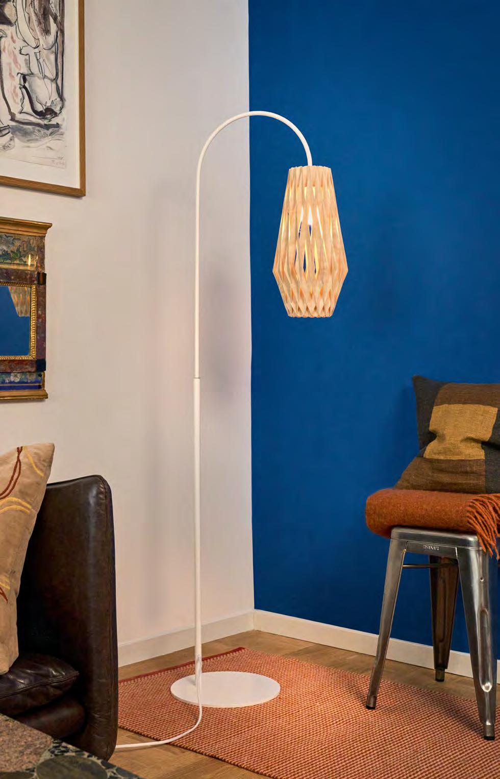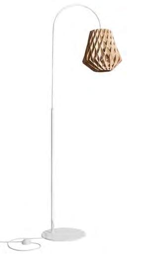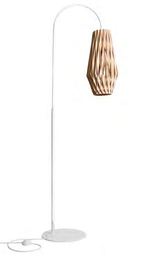 The floor lamp from the Pilke Signature Collection features a newly designed curved base, creating a drop-like silhouette together with the lampshade. The metal base is available in black or white, and can be paired with a black, white, or birch Signature Pendant 28 or Signature Pendant 20/42 as the shade. Each lampshade is hand-assembled from PEFC- or FSC-certified birch plywood, forming a geometric structure that creates a unique and atmospheric shadow play.