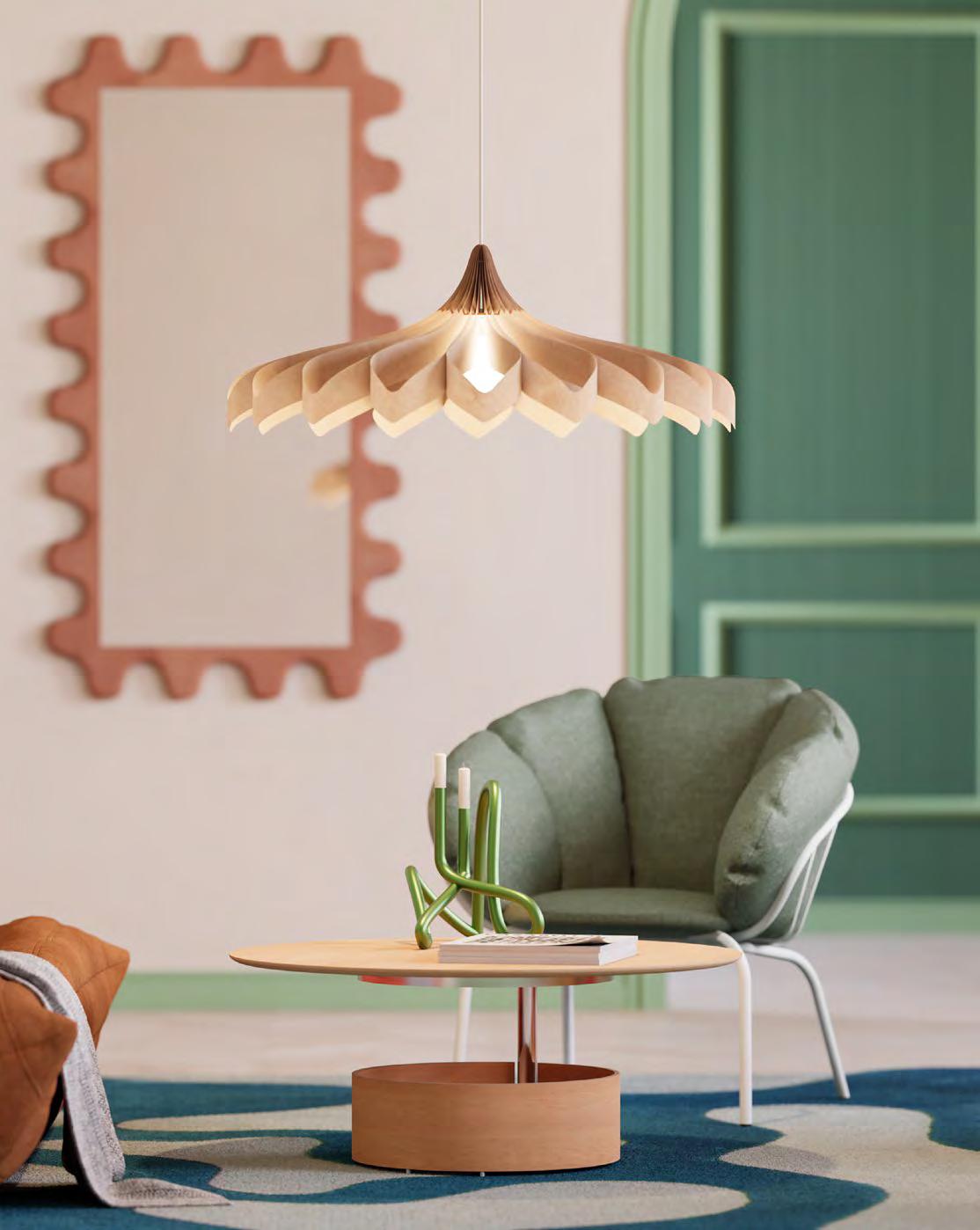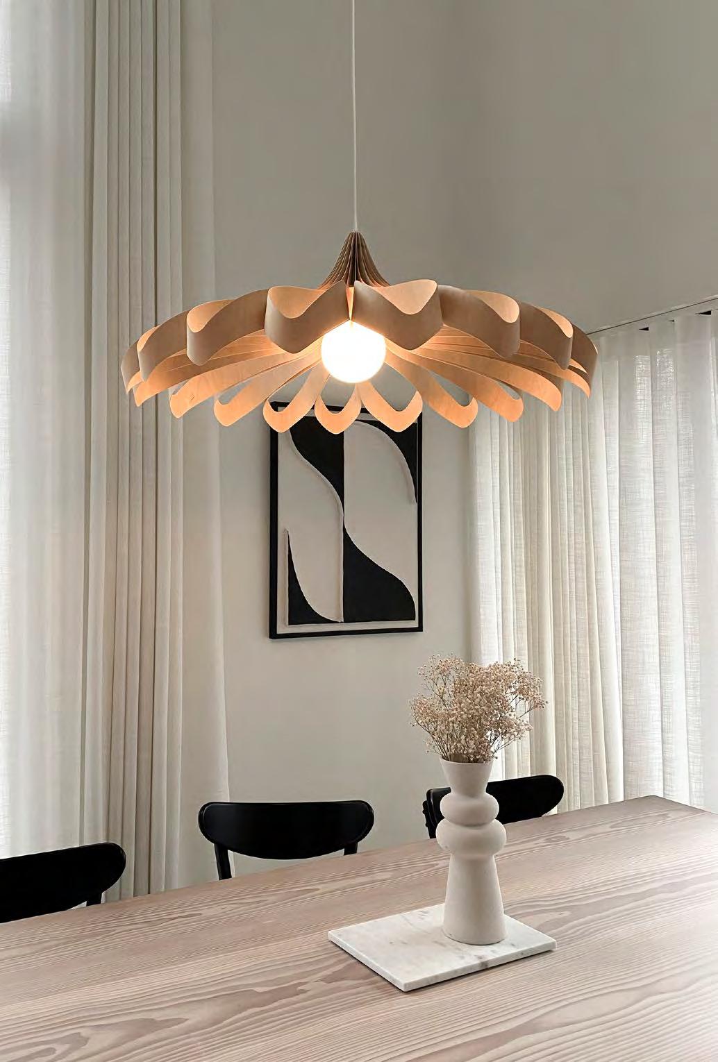 The Daisy S ceiling lamp, with a 60 cm diameter, offers a refined, nature-inspired design crafted from 0.4mm birch plywood. This lightweight wooden material enhances the lamp’s delicate, daisy-inspired structure, bringing a warm and cozy ambiance to smaller spaces. Ideal for dining areas, bedrooms, or living rooms, Daisy S combines elegance with the natural beauty of wood as part of the Blossom collection.