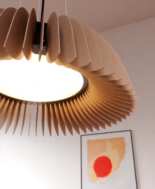 Made with FSC®- or PEFC-certified birch plywood, the lamp features 2.5mm thick birch plywood that is water-cut, giving the lamp a unique look and feel. Each Verna lamp is carefully assembled by hand, with rings in black painted wood and a row of “wings” attached, 30 pieces on the smallest, 34 on the middle and as many as 60 pieces on the largest – creating a beautiful downward light that’s perfect for any space. Simo Serpola was inspired by the essence of spring when he designed the series, Verna mean spring-green in Finnish.