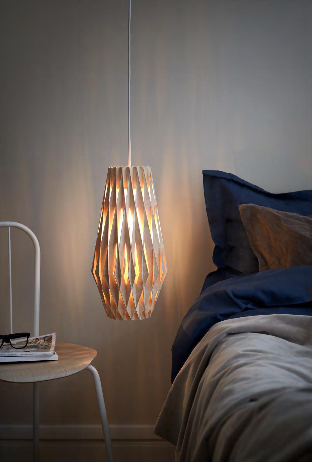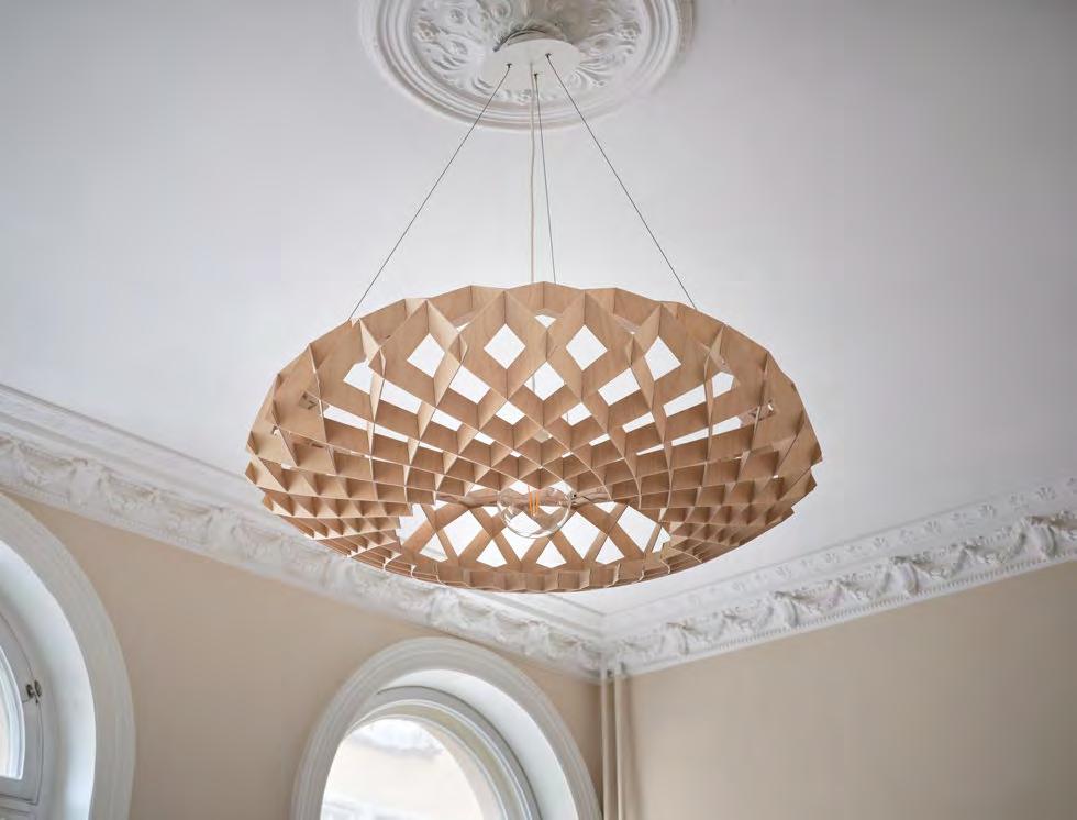 The Pilke 65 plafond ceiling light is a perfect centerpiece of your living room, lounge or bedroom. This design is an especially beautiful geometric creation. The LED light source is included, and three different brightness levels are available. The natural, sustainable wood brings warmth and wellbeing to your life. Traditional Finnish shingle work remastered by today’s computer technology enables assembly without using any glue or screws. Handcrafted in Finland.