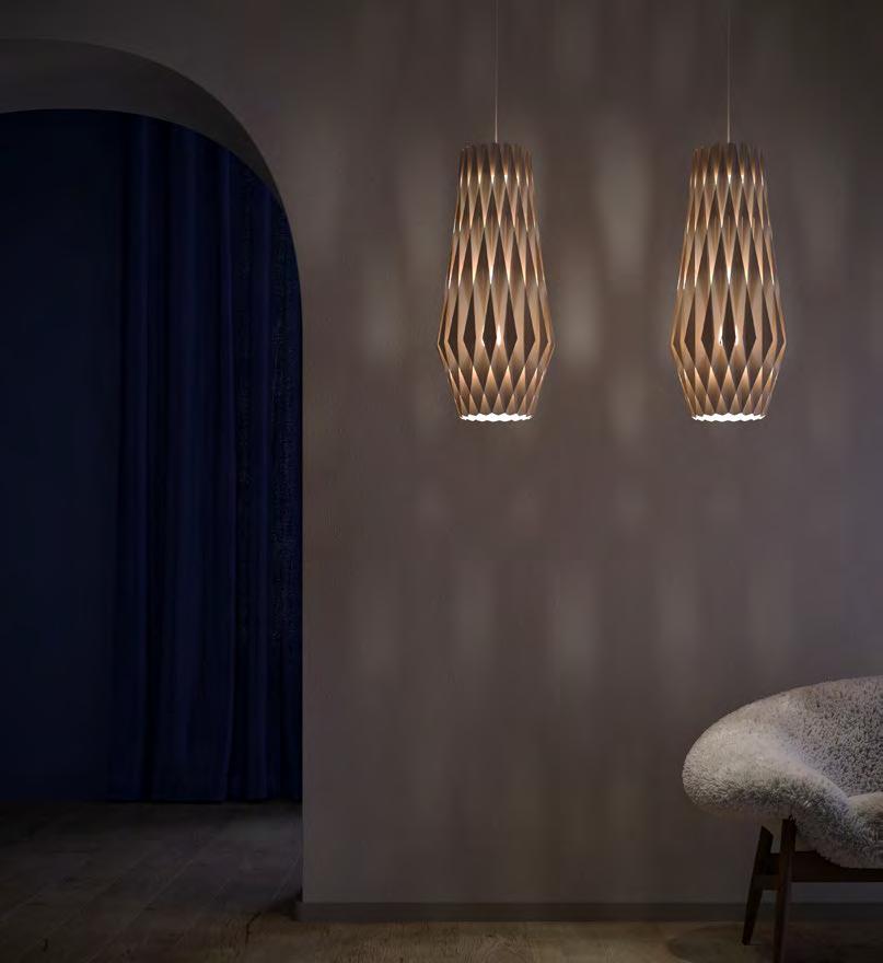 Signature Pendant 20/42 is a size smaller than Pendant 30/70, with the same ornamental appearance. The Pendant 20/42 makes a statement in any domestic or public space, install it in high spaces or staircases one by one or in a group. The lamp is handmade with elegant geometric design and natural, sustainable, FSC® or PEFC certified Finnish birch plywood. It provides warmth and creates a unique shadow play through the structure. It is assembled through traditional Finnish shingles work without using any screws or glue.