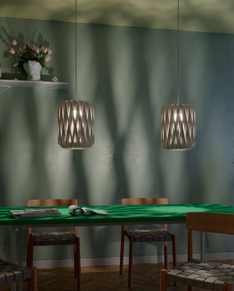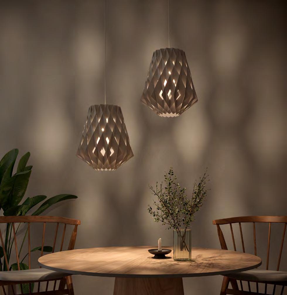 The pine cone shaped Pilke 28 brings nature from outdoors into the space and is fascinating to explore from every angle. For larger interiors, create and design your own statement chandelier by grouping several lamps together. The stylish geometric design and natural, sustainable wood bring warmth and wellbeing to your life. Traditional Finnish shingle work remastered by today’s computer technology enables assembly without using any glue or screws. Handcrafted in Finland.