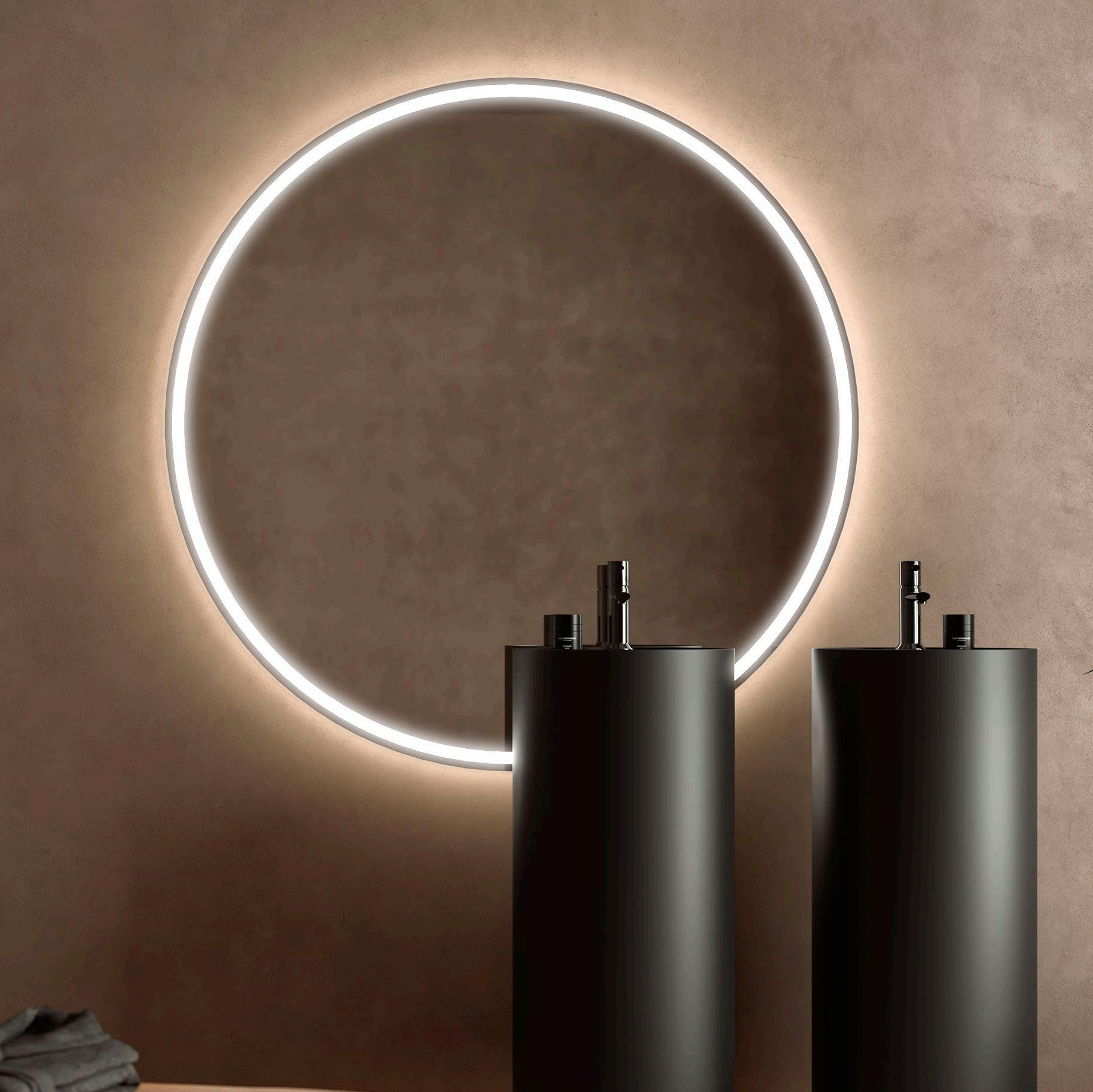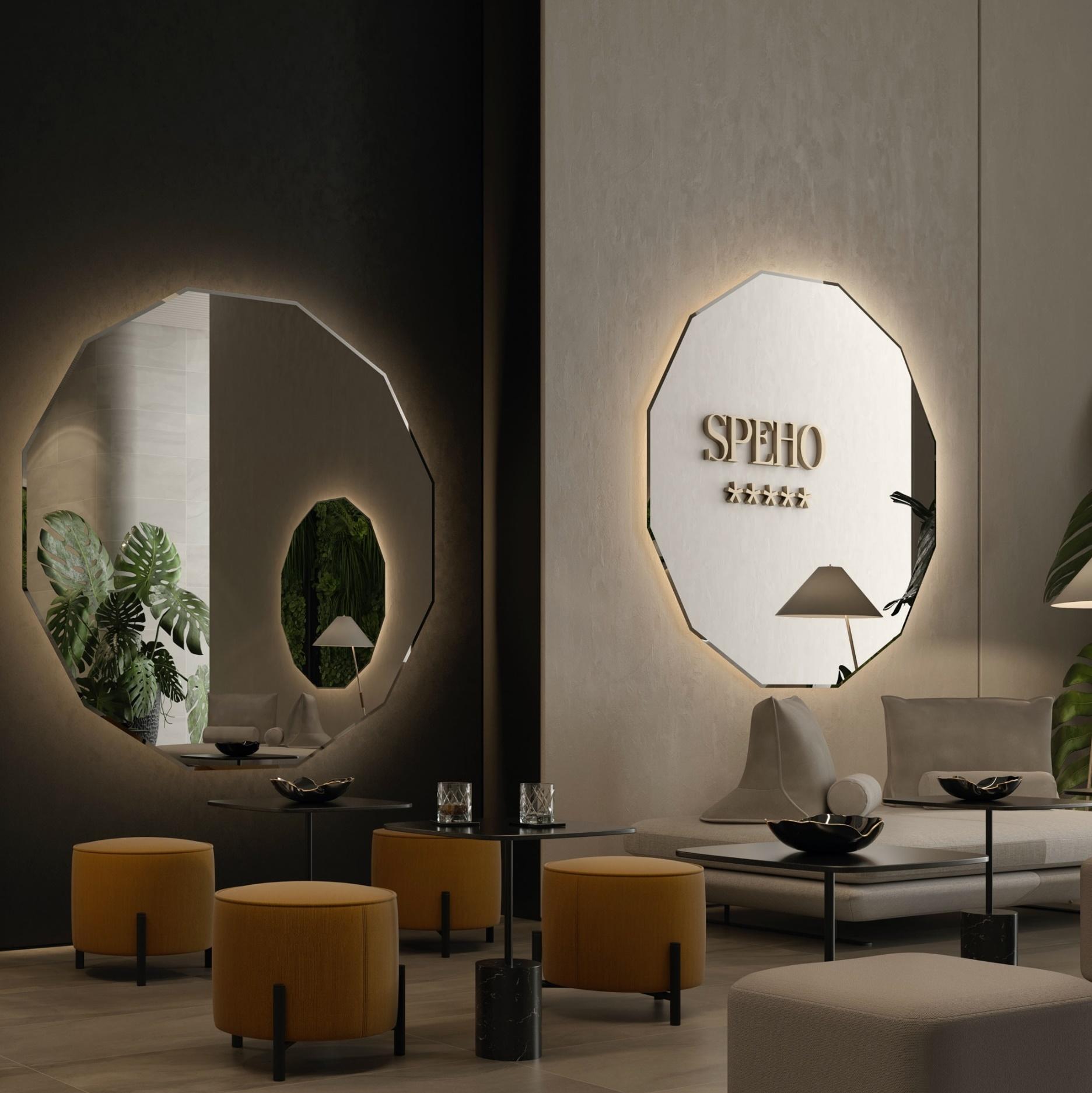 Mirrors with "direct and indirect" light through a perimetral sandblasting, Frameless, and smoothly polished edges to create a “free-floating effect" on the wall