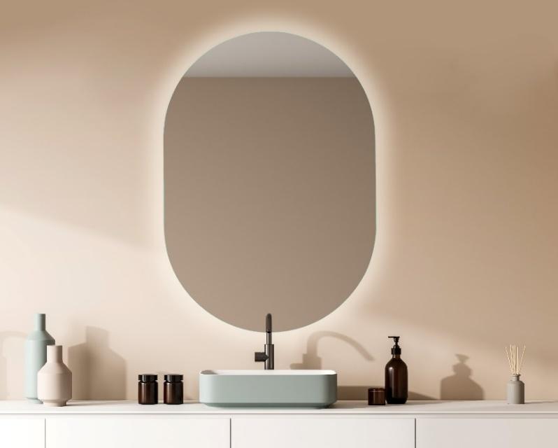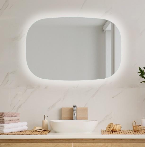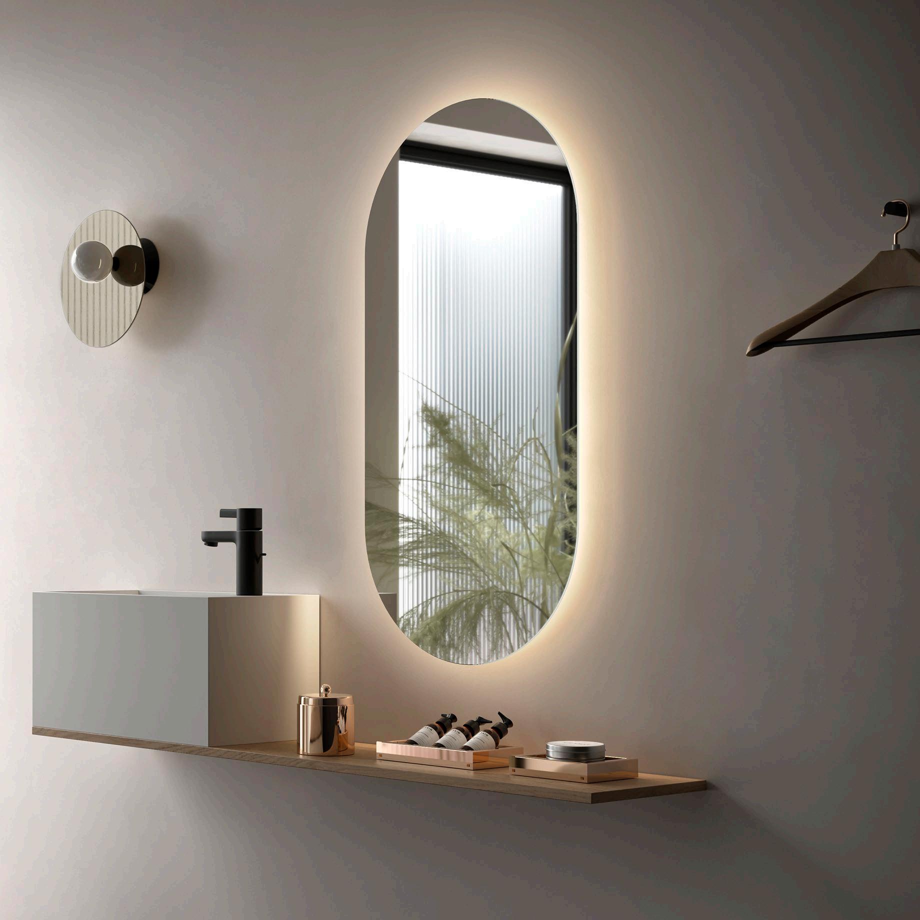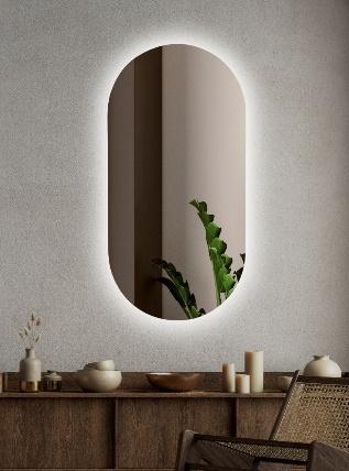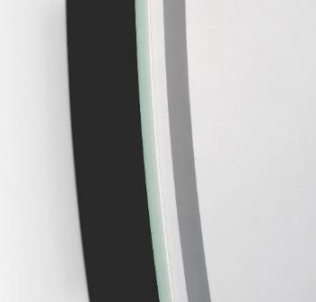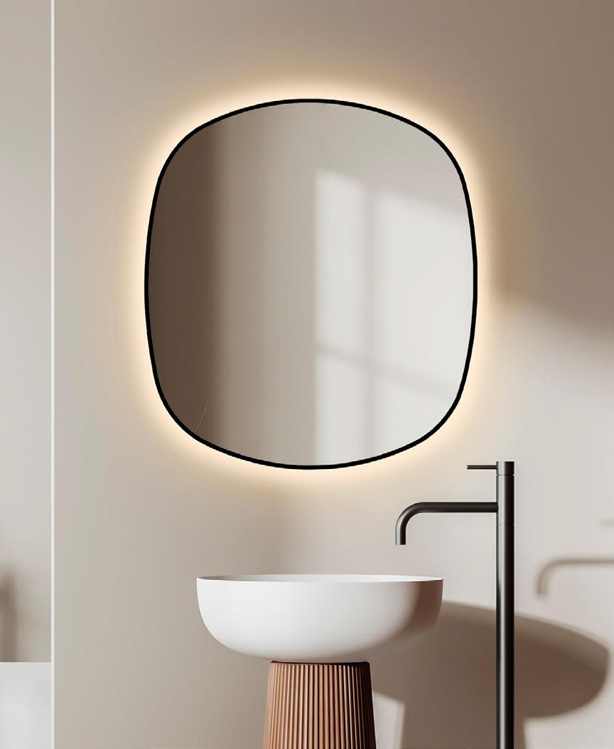 Espejo de formas orgánicas que ofrece una iluminación ambiente, resaltando su borde serigrafiado en colores personalizables Sin marco, con cantos suavemente pulidos para crear un “efecto volado” sobre la pared