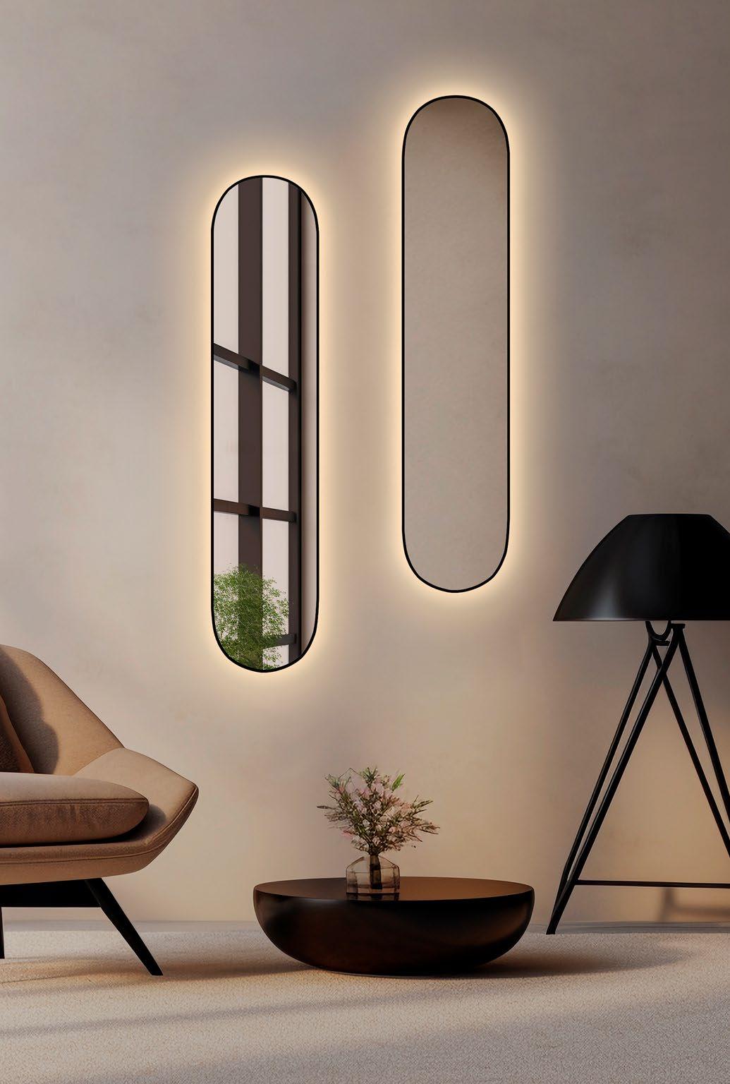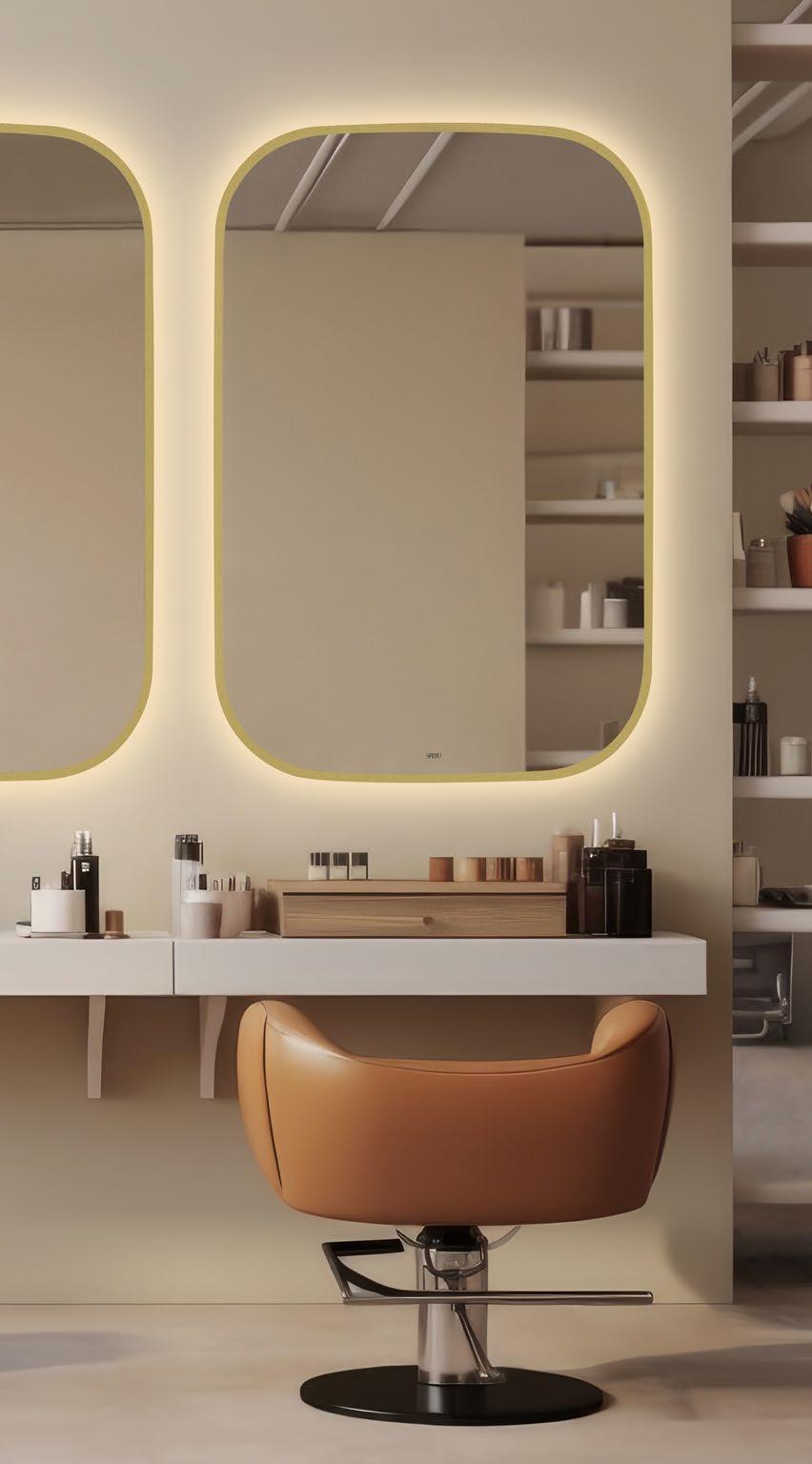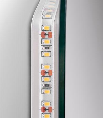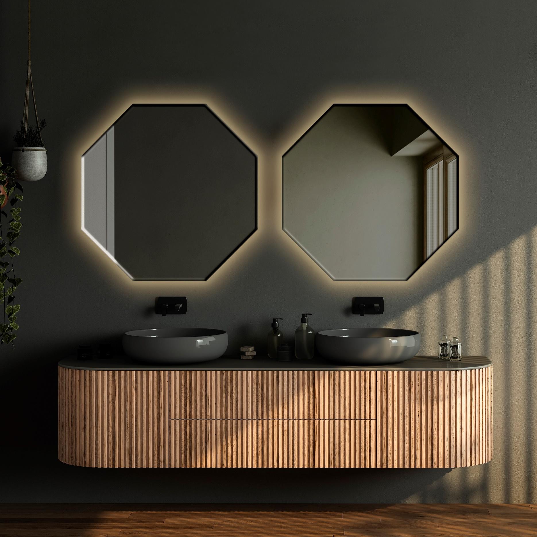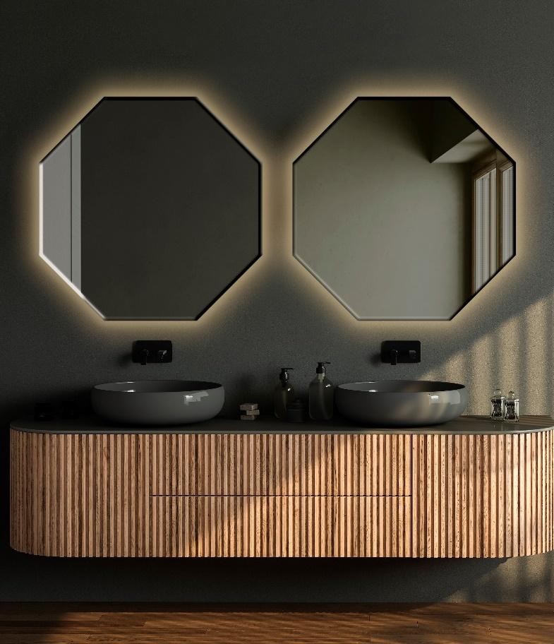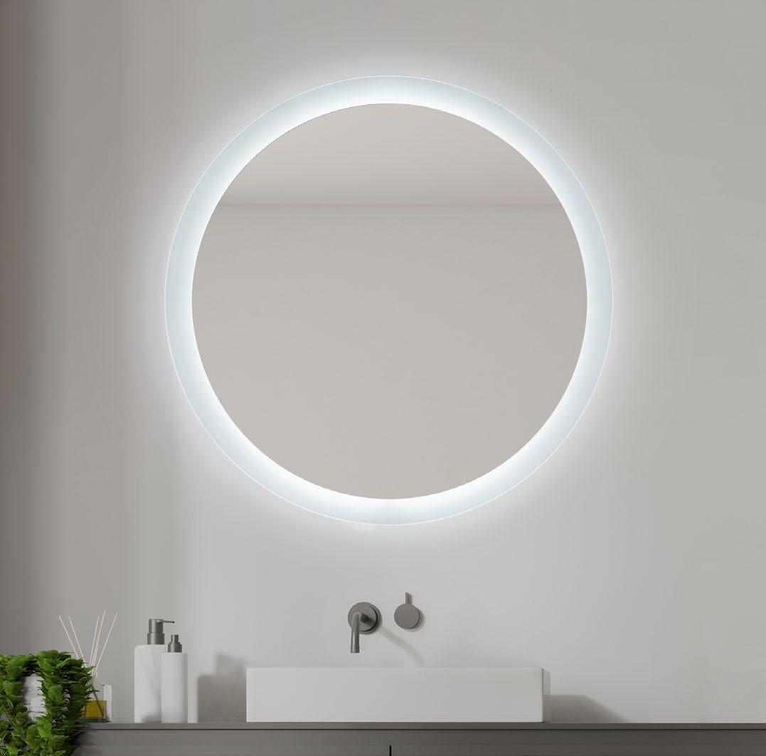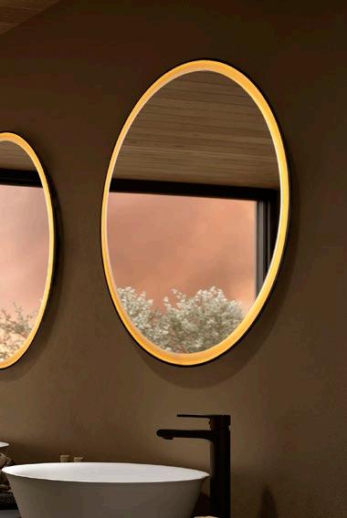 Espejos de iluminación indirecta sin marco, con cantos suavemente pulidos para crear un “efecto volado” sobre la pared