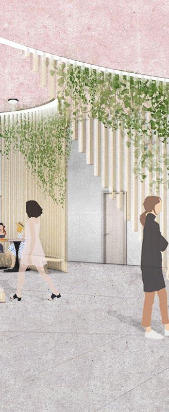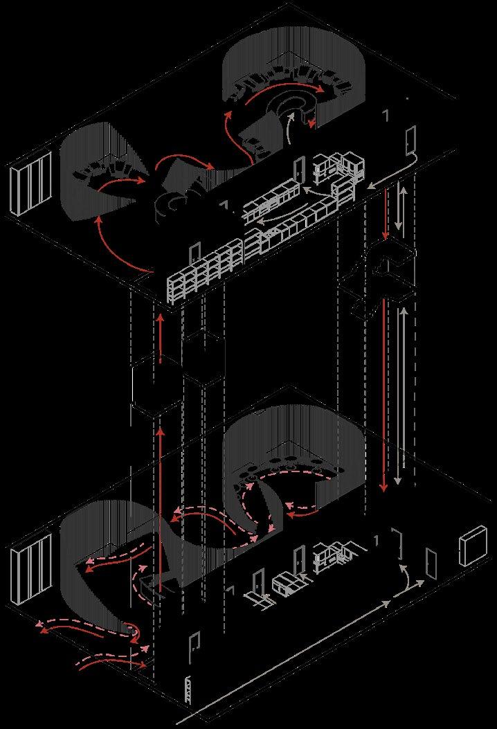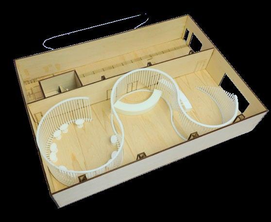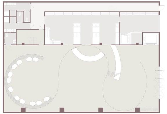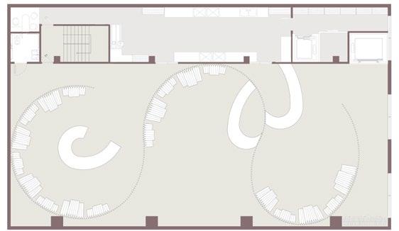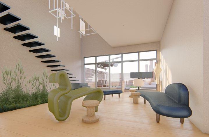 setting. The organic shapes of the furniture on the first floor are reminiscent of the curvilinear shape.