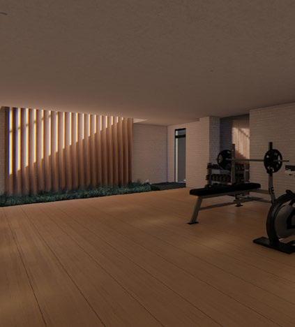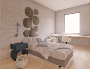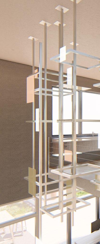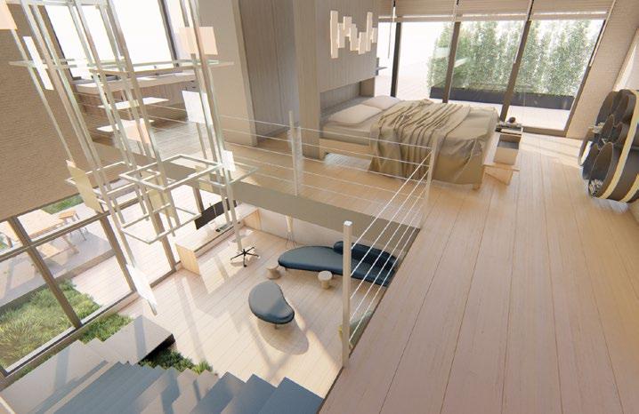 The family room designed for Trevor & Michael is simple and neutral overall décor with bold touches of color and with interesting shapes. The floor-toceiling windows make the space filled with natural light, and also open to an outdoor sculpture studio. The high ceiling and that floating staircase also give character to the space. The plants continue from the outdoor courtyard to the interior.