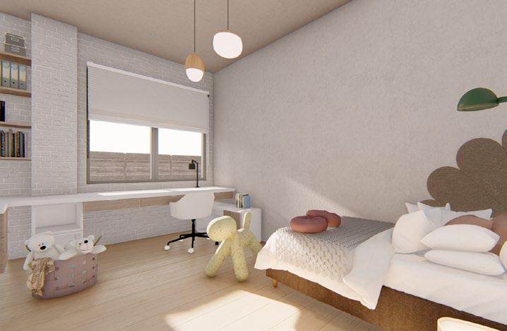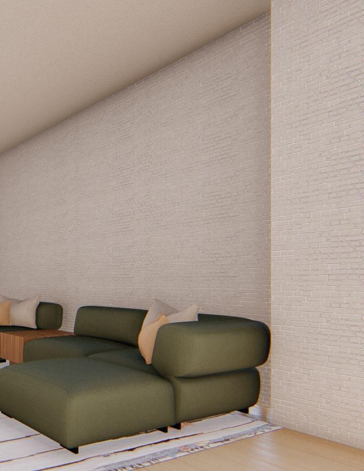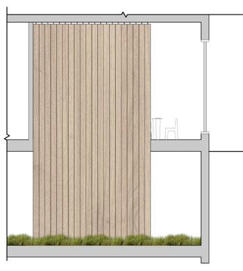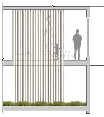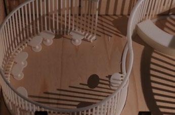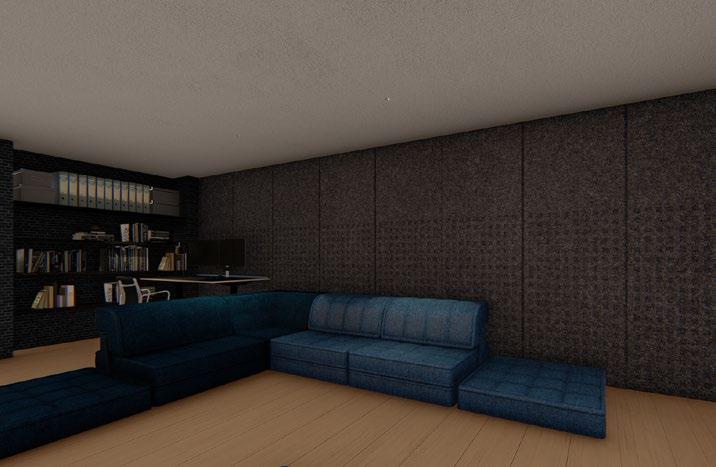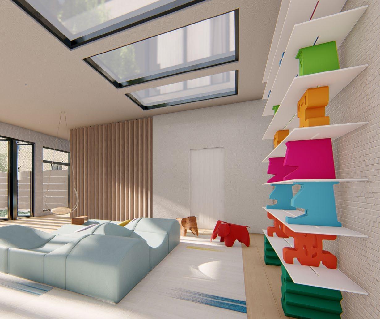 The screen wall, which connects the first floor and the basement, is made of thin stripes and pivot joints. The underground area is illuminated naturally by the cutout floor. Children’s safety is carefully considered when designing the panel’s dimensions, as they could potentially fall through the opening. The screen displays diverse perspective views of the kids’ playroom as the rotation pivots.