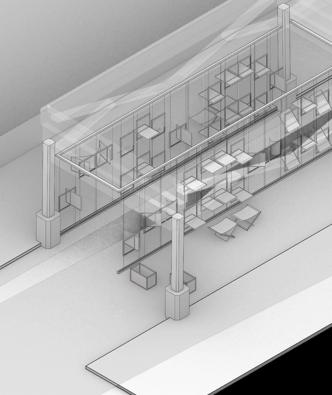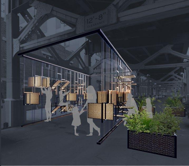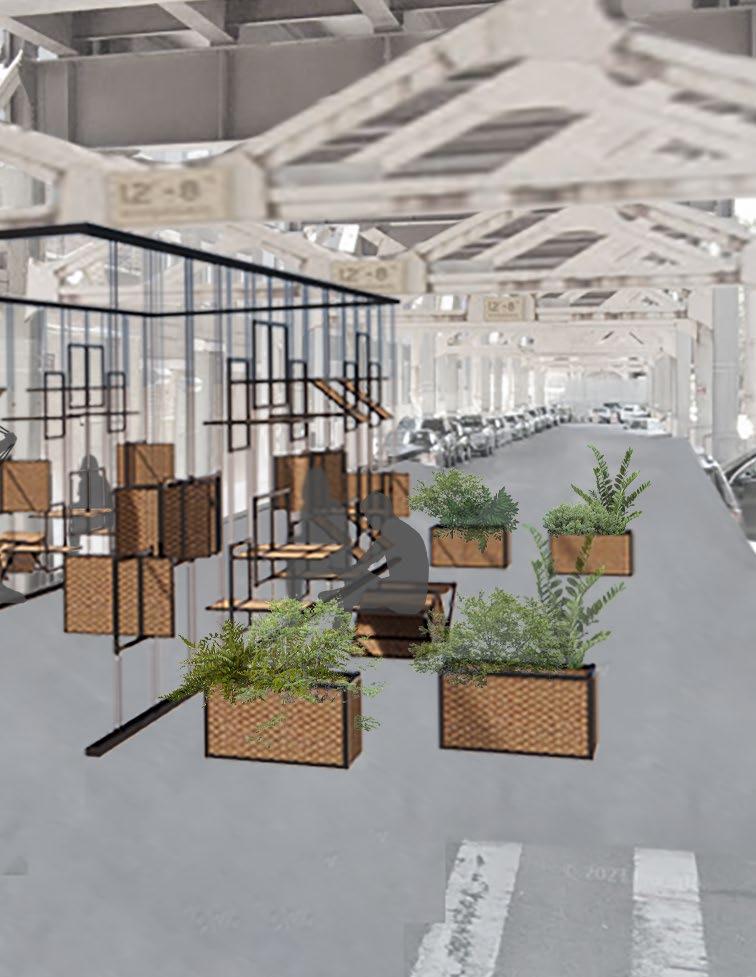 The project function as an outdoor dining space with expanded activities -- exercises. Through the exploration of and control of space, place, light, climatic consideration, materiality, and textural identification design interventions will need to be modular, reconfigurable in additive and subtractive manners, transportable and relocatable.