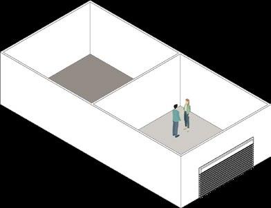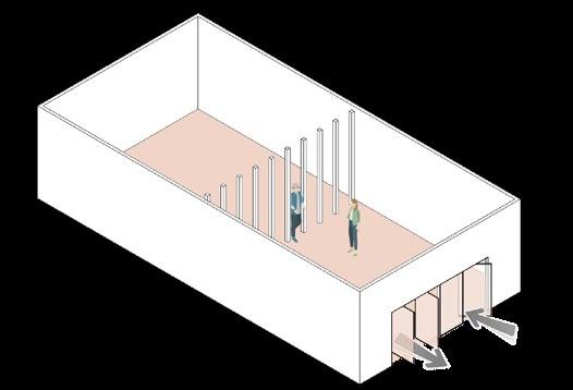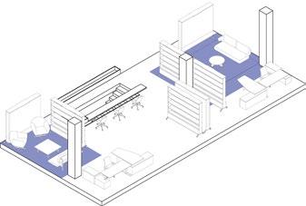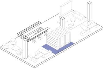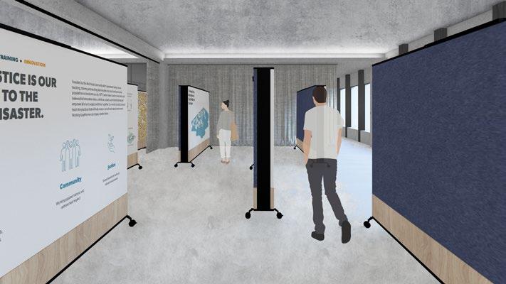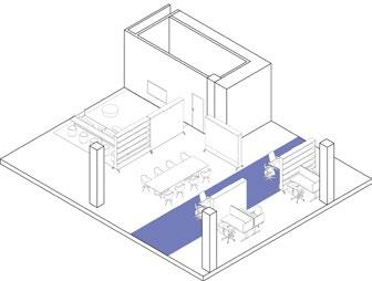 Given the limited budget and usage period, not many internal walls were constructed for the RETI center, which will be relocated back to Red Hook in two years. Moving furniture is used to create divisions within the room to maintain its adaptability.