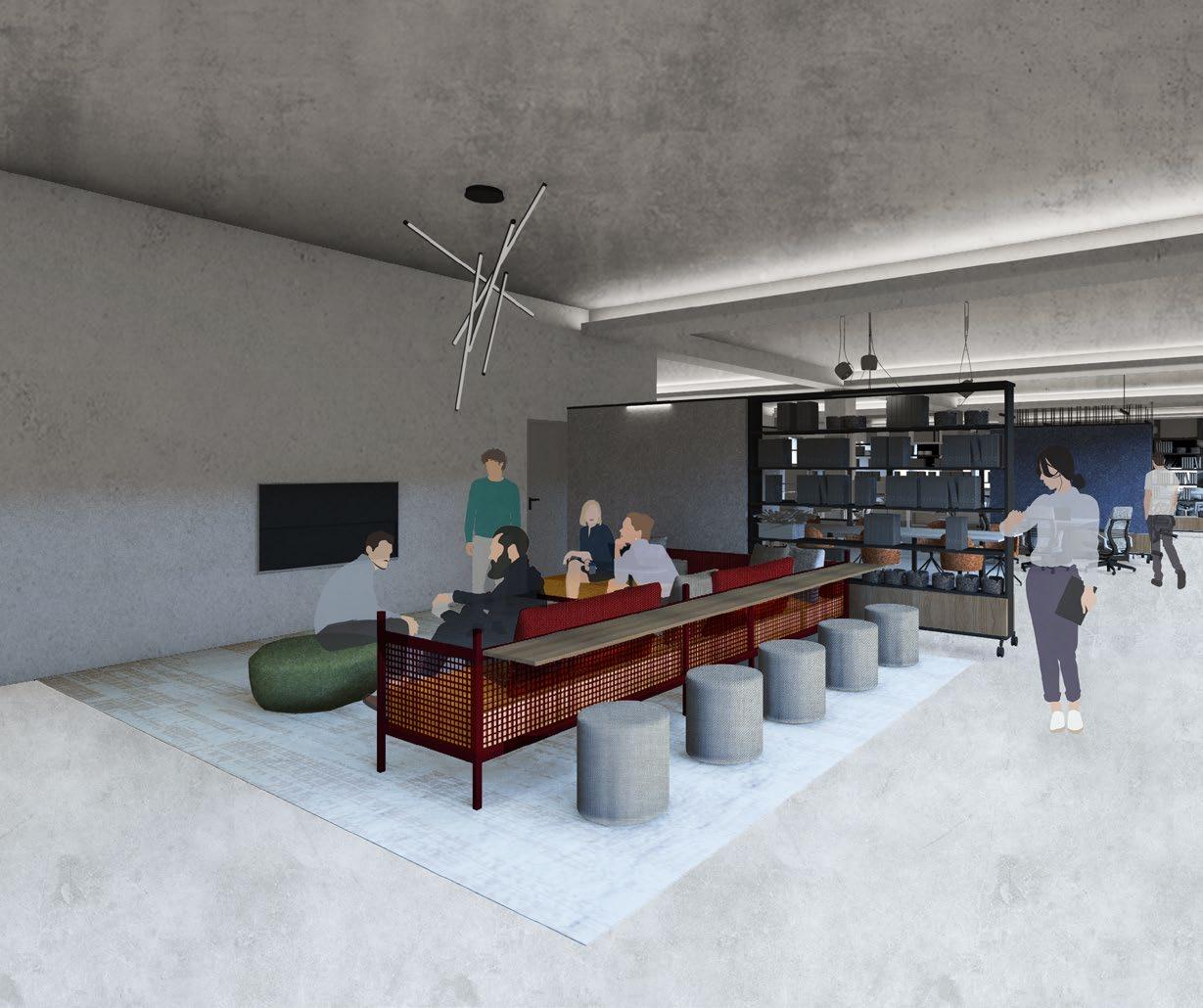 The sofas and stools can be used as a welcoming, informal reception space in addition to serving as an entrance space on the upper level. In this area, the same employees can relax and stretch. This area can be transformed into a conference room using mobile storage shelves. The meeting could be a part of a range of layouts, depending on the number of participants.