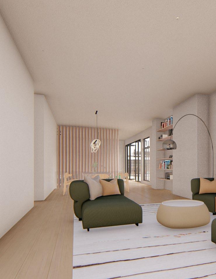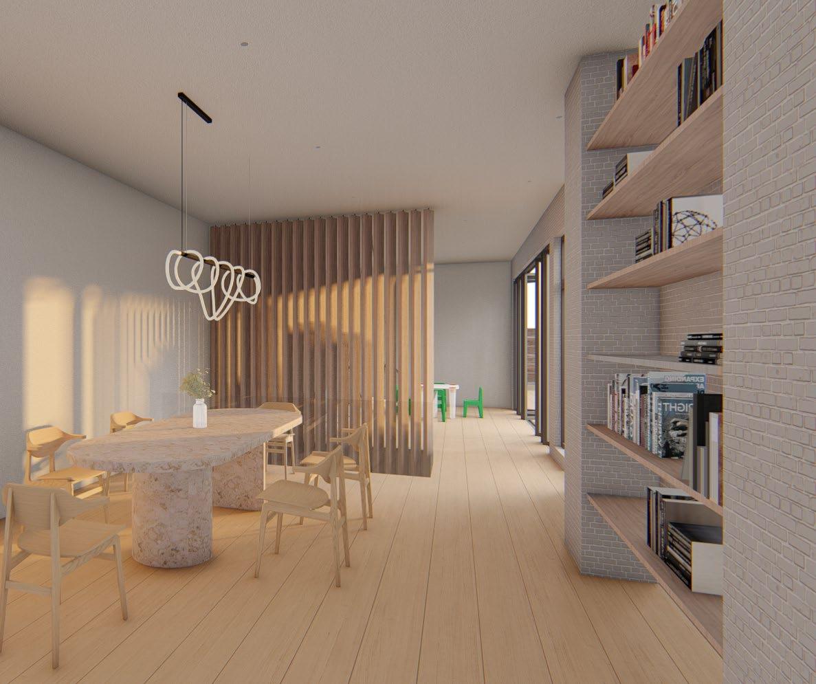 The home will be shared by two families, and the communal areas are designed to accommodate diverse needs. To make it easier for everyone to use the shared space, personal spaces are located all around it. In the house, private and communal spaces can coexist in harmony.