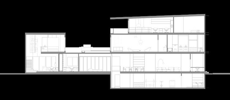 The cut-off floor, which joins the upper and lower level, maintains the continuity of the individual family spaces. The basement is given natural light thanks to the first level’s cut-off flooring.