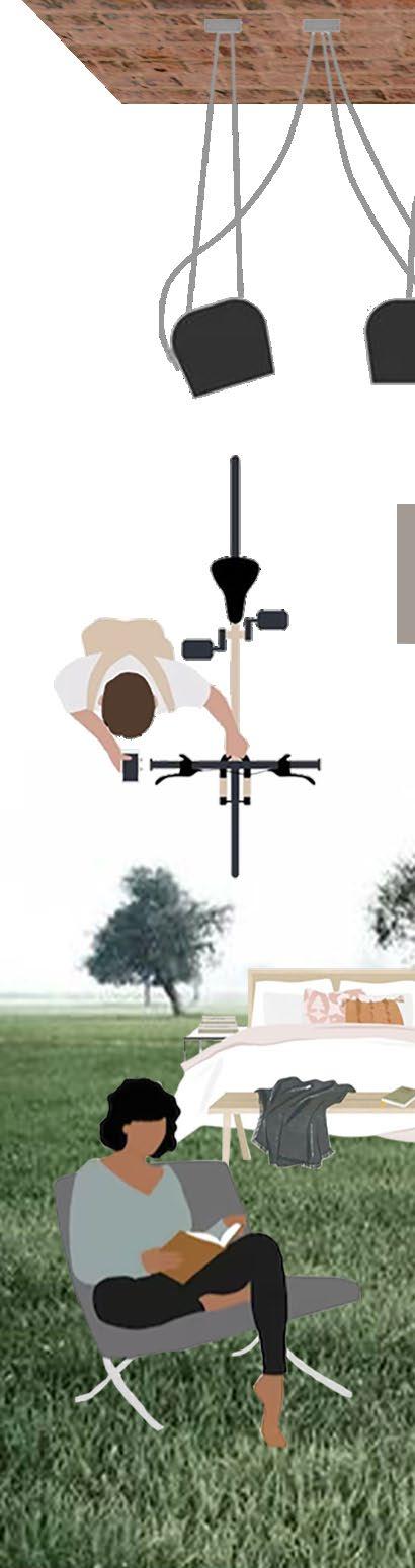 Also, taking into account the desire for exercise, mechanical fitness equipment is simplified and relocated to an outside area along with eating.